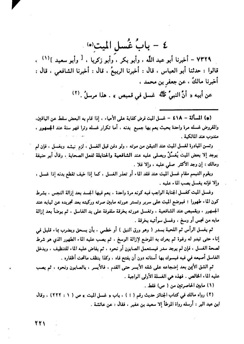 7329 - أَخْبَرَنَا أَبُو عَبْدِ اللَّهِ، وَأَبُو بَكْرٍ، وَأَبُو زَكَرِيَّا، وَأَبُو سَعِيدٍ قَالُوا: حَدَّثَنَا أَبُو الْعَبَّاسِ قَالَ: أَخْبَرَنَا الرَّبِيعُ قَالَ: أَخْبَرَنَا الشَّافِعِيُّ قَالَ: أَخْبَرَنَا مَالِكٌ، عَنْ جَعْفَرِ بْنِ مُحَمَّدٍ، عَنْ أَبِيهِ، § «أَنَّ النَّبِيَّ صَلَّى اللهُ عَلَيْهِ وَسَلَّمَ غُسِّلَ فِي قَمِيصٍ». هَذَا مُرْسَلٌ -[222]-