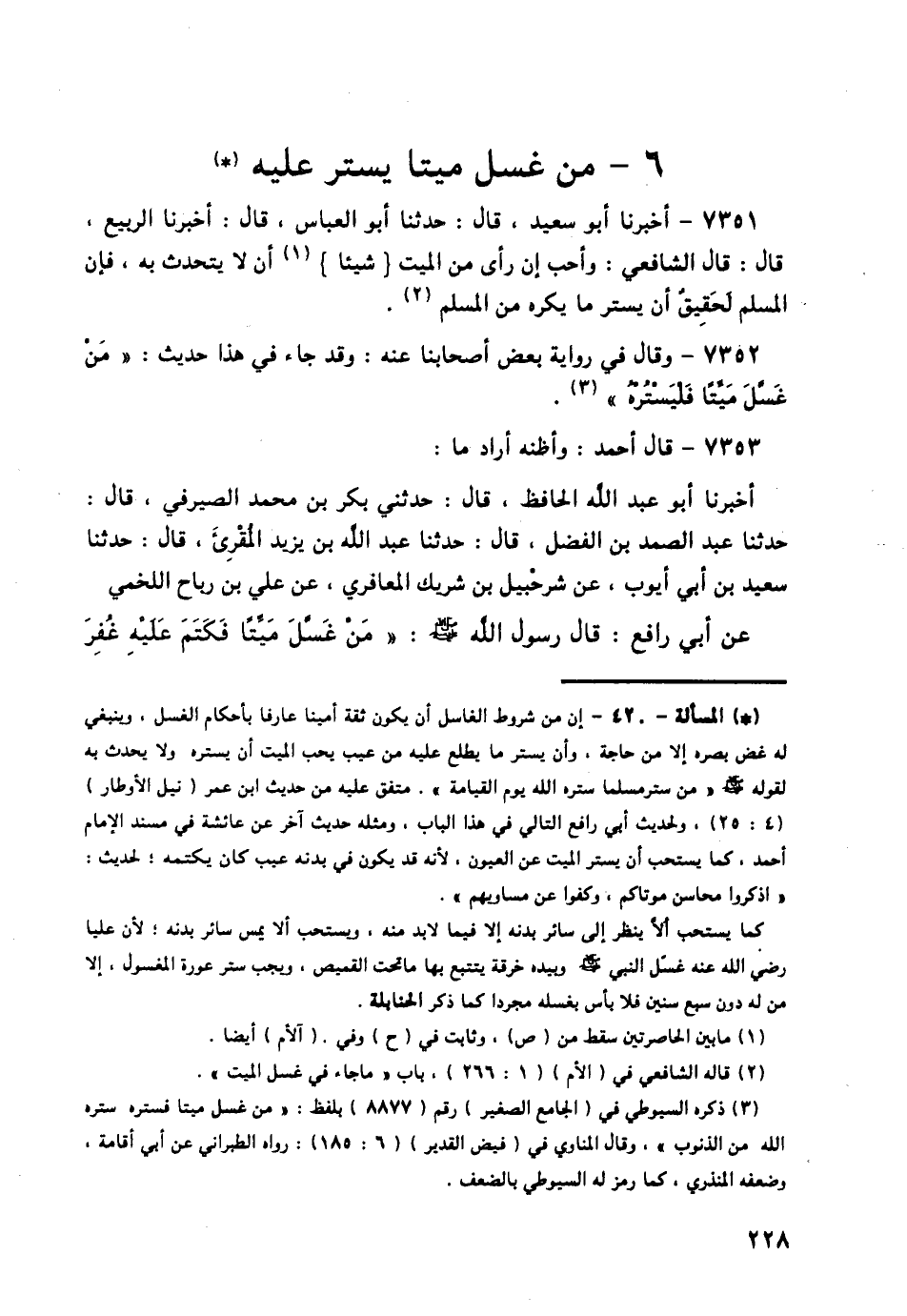 7351 - أَخْبَرَنَا أَبُو سَعِيدٍ قَالَ: حَدَّثَنَا أَبُو الْعَبَّاسِ قَالَ: أَخْبَرَنَا الرَّبِيعُ قَالَ: قَالَ الشَّافِعِيُّ: § «وَأُحِبُّ إِنْ رَأَى مِنَ الْمَيِّتِ شَيْئًا أَنْ لَا يَتَحَدَّثَ بِهِ، فَإِنَّ الْمُسْلِمَ لَحَقِيقٌ أَنْ يَسْتُرَ مَا يَكْرَهُ مِنَ الْمُسْلِمِ»
