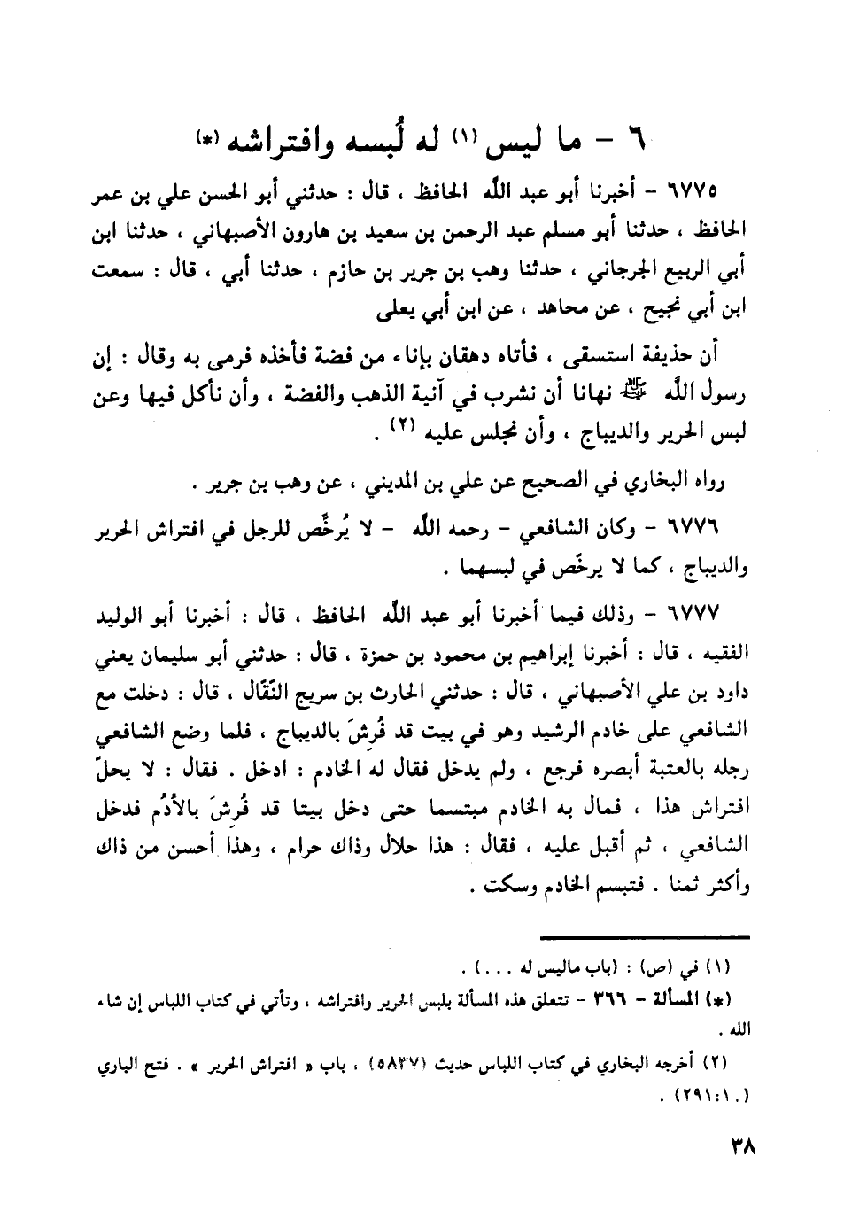 6775 - أَخْبَرَنَا أَبُو عَبْدِ اللَّهِ الْحَافِظُ قَالَ: حَدَّثَنِي أَبُو الْحَسَنِ عَلِيُّ بْنُ عُمَرَ الْحَافِظُ، حَدَّثَنَا أَبُو مُسْلِمٍ عَبْدُ الرَّحْمَنِ بْنُ سَعِيدِ بْنِ هَارُونَ الْأَصْبَهَانِيُّ، حَدَّثَنَا ابْنُ أَبِي الرَّبِيعِ الْجُرْجَانِيُّ، حَدَّثَنَا وَهْبُ بْنُ جَرِيرِ بْنِ حَازِمٍ، حَدَّثَنَا أَبِي قَالَ: سَمِعْتُ ابْنَ أَبِي نَجِيحٍ، عَنْ مُجَاهِدٍ، عَنِ ابْنِ أَبِي لَيْلَى، أَنَّ حُذَيْفَةَ اسْتَسْقَى، فَأَتَاهُ دِهْقَانُ بِإِنَاءٍ مِنْ فِضَّةٍ فَأَخَذَهُ فَرَمَى بِهِ وَقَالَ: «إِنَّ §رَسُولَ اللَّهِ صَلَّى اللهُ عَلَيْهِ وَسَلَّمَ نَهَانَا أَنْ نَشْرَبَ فِي آنِيَةِ الذَّهَبِ وَالْفِضَّةِ، وَأَنْ نَأْكُلَ فِيهَا، وَعَنْ لُبْسِ الْحَرِيرِ وَالدِّيبَاجِ، وَأَنْ نَجْلِسَ عَلَيْهِ» رَوَاهُ الْبُخَارِيُّ فِي الصَّحِيحِ عَنْ عَلِيِّ بْنِ الْمَدِينِيِّ، عَنْ وَهْبِ بْنِ جَرِيرٍ