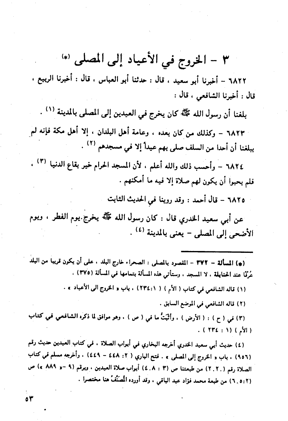 6825 - قَالَ أَحْمَدُ: «وَقَدْ رُوِّينَا فِي الْحَدِيثِ الثَّابِتِ» عَنْ أَبِي سَعِيدٍ الْخُدْرِيِّ قَالَ: كَانَ رَسُولُ اللَّهِ صَلَّى اللهُ عَلَيْهِ وَسَلَّمَ «§يَخْرُجُ يَوْمَ الْفِطْرِ، وَيَوْمَ الْأَضْحَى إِلَى الْمُصَلَّى، يَعْنِي بِالْمَدِينَةِ»