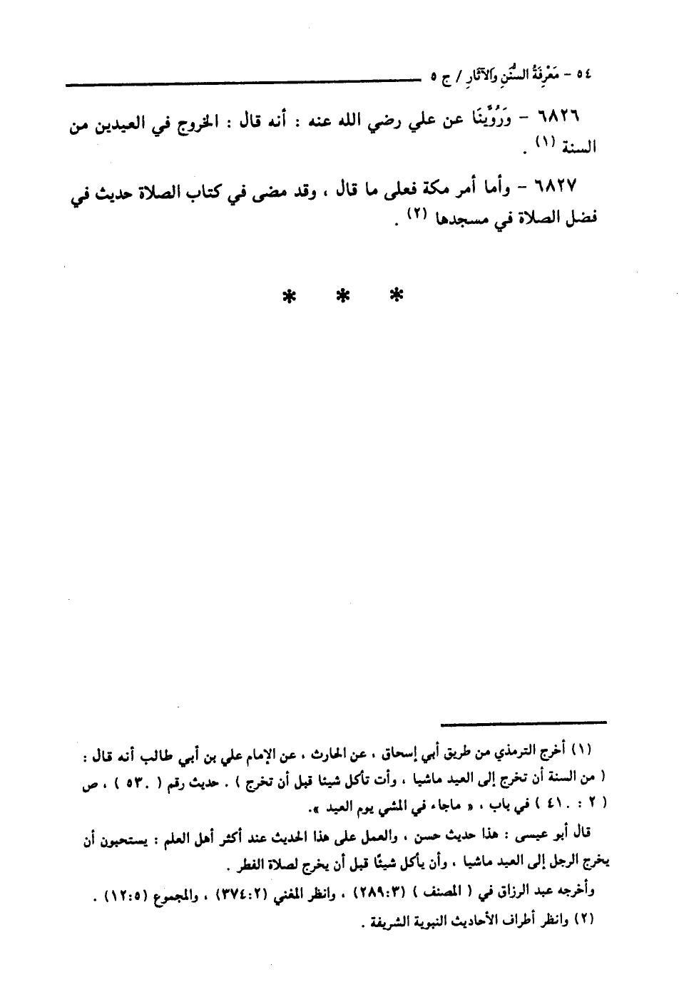 6826 - وَرُوِّينَا عَنْ عَلِيٍّ، رَضِيَ اللَّهُ عَنْهُ: أَنَّهُ قَالَ: § «الْخُرُوجُ فِي الْعِيدَيْنِ مِنَ السُّنَّةِ»