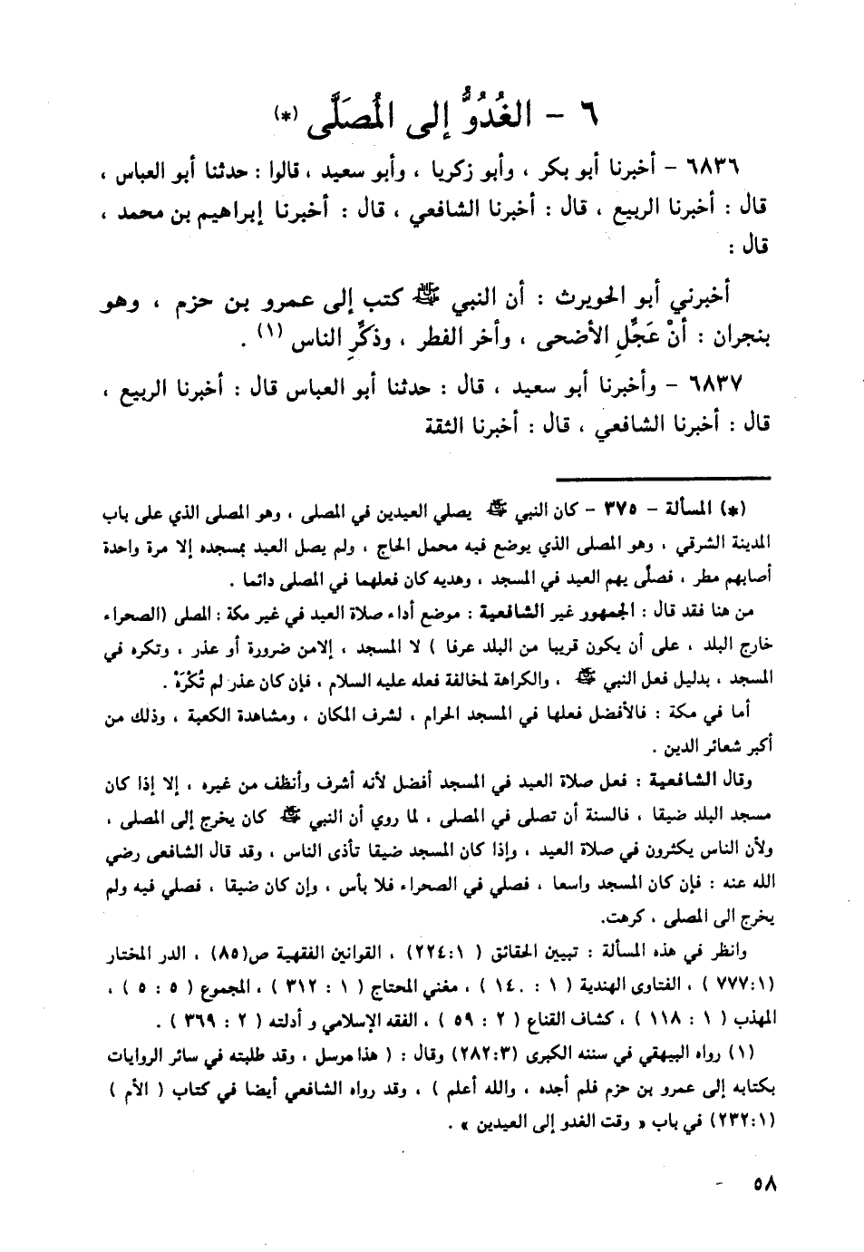 6837 - وَأَخْبَرَنَا أَبُو سَعِيدٍ قَالَ: حَدَّثَنَا أَبُو الْعَبَّاسِ قَالَ: أَخْبَرَنَا الرَّبِيعُ قَالَ: أَخْبَرَنَا الشَّافِعِيُّ قَالَ: أَخْبَرَنَا الثِّقَةُ -[59]-، أَنَّ الْحَسَنَ، كَانَ يَقُولُ: «إِنَّ النَّبِيَّ صَلَّى اللهُ عَلَيْهِ وَسَلَّمَ كَانَ §يَغْدُو إِلَى الْأَضْحَى وَالْفِطْرِ حِينَ تَطْلُعُ الشَّمْسُ فَيَتَتَامُّ طُلُوعُهَا»