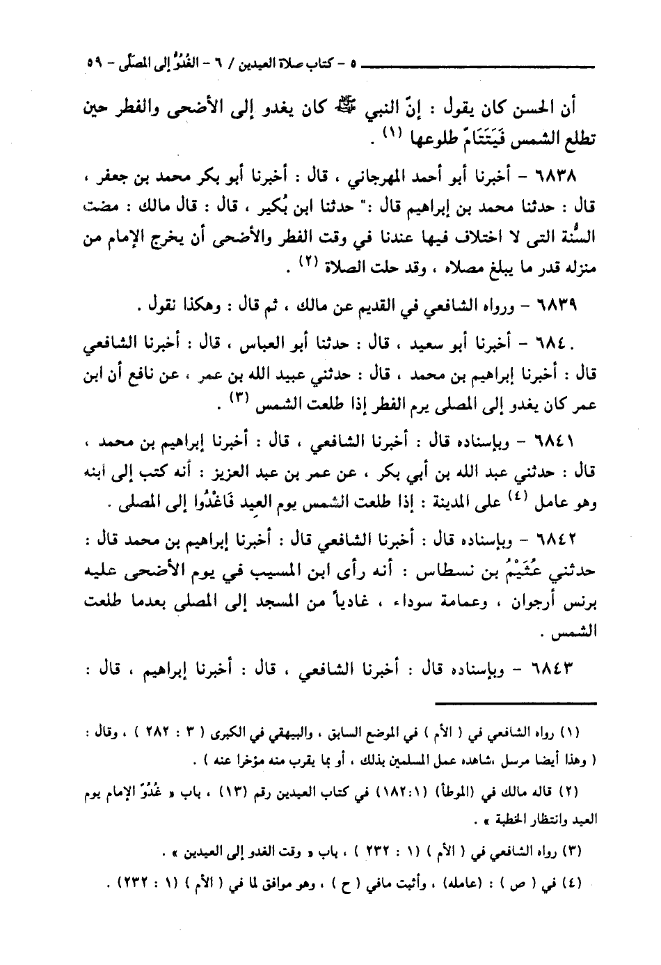 6840 - أَخْبَرَنَا أَبُو سَعِيدٍ قَالَ: حَدَّثَنَا أَبُو الْعَبَّاسِ قَالَ: أَخْبَرَنَا الشَّافِعِيُّ قَالَ: أَخْبَرَنَا إِبْرَاهِيمُ بْنُ مُحَمَّدٍ قَالَ: حَدَّثَنِي عُبَيْدُ اللَّهِ بْنُ عُمَرَ، عَنْ نَافِعٍ، أَنَّ ابْنَ عُمَرَ، كَانَ § «يَغْدُو إِلَى الْمُصَلَّى يَوْمَ الْفِطْرِ إِذَا طَلَعَتِ الشَّمْسُ»