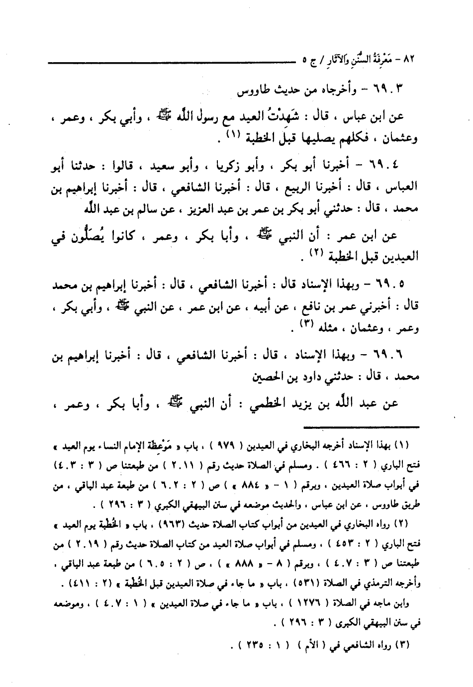 6904 - أَخْبَرَنَا أَبُو بَكْرٍ، وَأَبُو زَكَرِيَّا، وَأَبُو سَعِيدٍ قَالُوا: حَدَّثَنَا أَبُو الْعَبَّاسِ قَالَ: أَخْبَرَنَا الرَّبِيعُ قَالَ: أَخْبَرَنَا الشَّافِعِيُّ قَالَ: أَخْبَرَنَا إِبْرَاهِيمُ بْنُ مُحَمَّدٍ قَالَ: حَدَّثَنِي أَبُو بَكْرِ بْنُ عُمَرَ بْنِ عَبْدِ الْعَزِيزِ، عَنْ سَالِمِ بْنِ عَبْدِ اللَّهِ، عَنِ ابْنِ عُمَرَ، أَنَّ النَّبِيَّ صَلَّى اللهُ عَلَيْهِ وَسَلَّمَ، وَأَبَا بَكْرٍ، وَعُمَرَ، كَانُوا «§يُصَلُّونَ فِي الْعِيدَيْنِ قَبْلَ الْخُطْبَةِ»