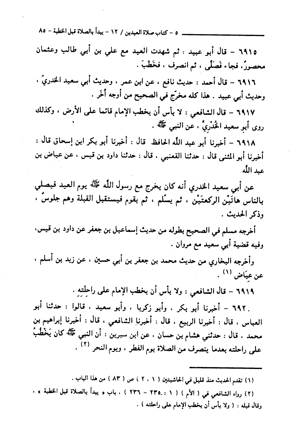 6920 - أَخْبَرَنَا أَبُو بَكْرٍ، وَأَبُو زَكَرِيَّا، وَأَبُو سَعِيدٍ قَالُوا: حَدَّثَنَا أَبُو الْعَبَّاسِ قَالَ: أَخْبَرَنَا الرَّبِيعُ قَالَ: أَخْبَرَنَا الشَّافِعِيُّ قَالَ: أَخْبَرَنَا إِبْرَاهِيمُ بْنُ مُحَمَّدٍ قَالَ: حَدَّثَنِي هِشَامُ بْنُ حَسَّانَ، عَنِ ابْنِ سِيرِينَ، أَنَّ النَّبِيَّ صَلَّى اللهُ عَلَيْهِ وَسَلَّمَ كَانَ «§يَخْطُبُ عَلَى رَاحِلَتِهِ بَعْدَمَا يَنْصَرِفُ مِنَ الصَّلَاةِ يَوْمَ الْفِطْرِ، وَيَوْمَ النَّحْرِ» -[86]-