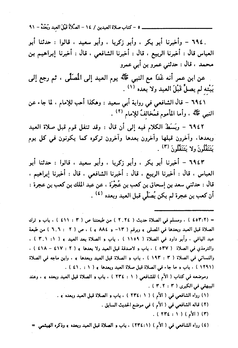 6940 - وَأَخْبَرَنَا أَبُو بَكْرٍ، وَأَبُو زَكَرِيَّا، وَأَبُو سَعِيدٍ قَالُوا: حَدَّثَنَا أَبُو الْعَبَّاسِ قَالَ: أَخْبَرَنَا الرَّبِيعُ قَالَ: أَخْبَرَنَا الشَّافِعِيُّ قَالَ: أَخْبَرَنَا إِبْرَاهِيمُ بْنُ مُحَمَّدٍ قَالَ: حَدَّثَنِي عَمْرُو بْنُ أَبِي عَمْرٍو، عَنِ ابْنِ عُمَرَ، أَنَّهُ § «غَدَا مَعَ النَّبِيِّ صَلَّى اللهُ عَلَيْهِ وَسَلَّمَ يَوْمَ الْعِيدِ إِلَى الْمُصَلَّى، ثُمَّ رَجَعَ إِلَى بَيْتِهِ لَمْ يُصَلِّ قَبْلَ الْعِيدِ وَلَا بَعْدَهُ»