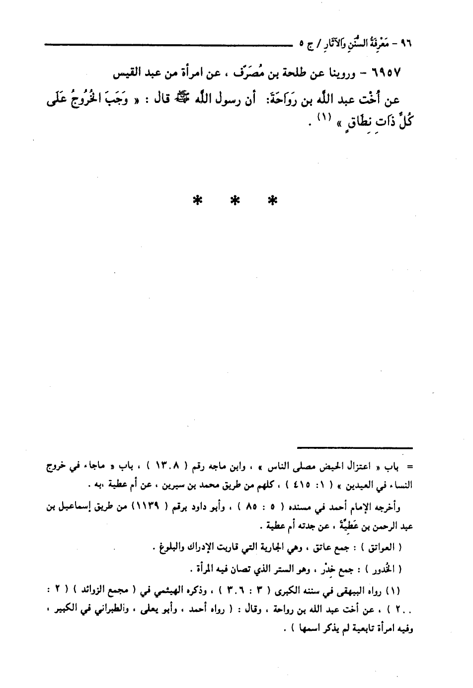 6957 - وَرُوِّينَا عَنْ طَلْحَةَ بْنِ مُصَرِّفٍ، عَنِ امْرَأَةٍ مِنْ عَبْدِ الْقَيْسِ، عَنْ أُخْتِ عَبْدِ اللَّهِ بْنِ رَوَاحَةَ، أَنَّ رَسُولَ اللَّهِ صَلَّى اللهُ عَلَيْهِ وَسَلَّمَ قَالَ: § «وَجَبَ الْخُرُوجُ عَلَى كُلِّ ذَاتِ نِطَاقٍ»