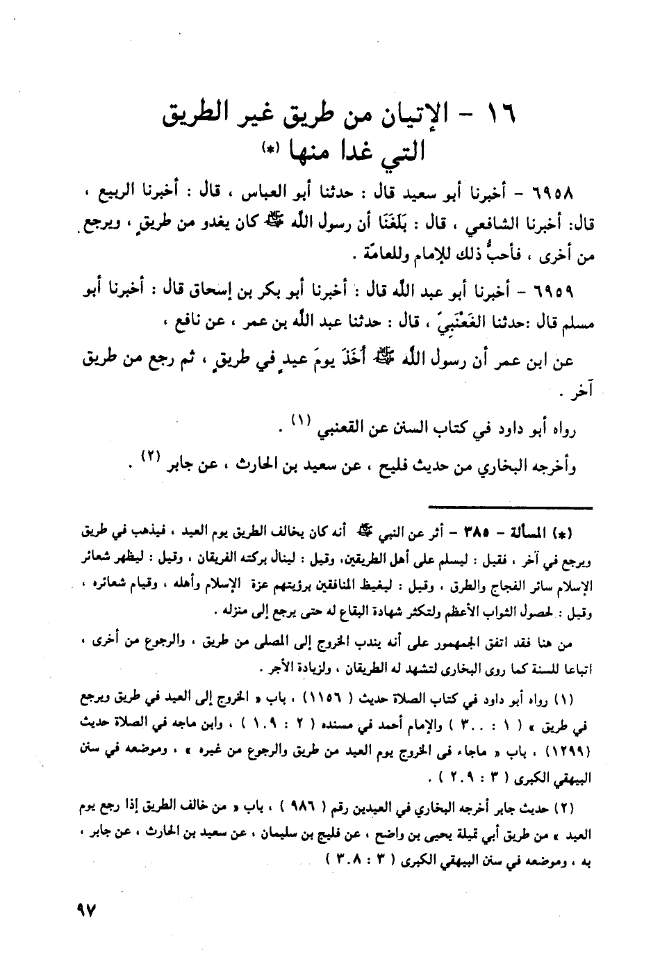 6959 - أَخْبَرَنَا أَبُو عَبْدِ اللَّهِ قَالَ: أَخْبَرَنَا أَبُو بَكْرِ بْنُ إِسْحَاقَ قَالَ: أَخْبَرَنَا أَبُو مُسْلِمٍ قَالَ: حَدَّثَنَا الْقَعْنَبِيُّ قَالَ: حَدَّثَنَا عَبْدُ اللَّهِ بْنُ عُمَرَ، عَنْ نَافِعٍ، عَنِ ابْنِ عُمَرَ، أَنَّ رَسُولَ اللَّهِ صَلَّى اللهُ عَلَيْهِ وَسَلَّمَ، «§أَخَذَ يَوْمَ عِيدٍ فِي طَرِيقٍ، ثُمَّ رَجَعَ مِنْ طَرِيقٍ آخَرَ» رَوَاهُ أَبُو دَاوُدَ فِي كِتَابِ السُّنَنِ عَنِ الْقَعْنَبِيِّ. وَأَخْرَجَهُ الْبُخَارِيُّ مِنْ حَدِيثِ فُلَيْحٍ، عَنْ سَعِيدِ بْنِ الْحَارِثِ، عَنْ جَابِرٍ -[98]-