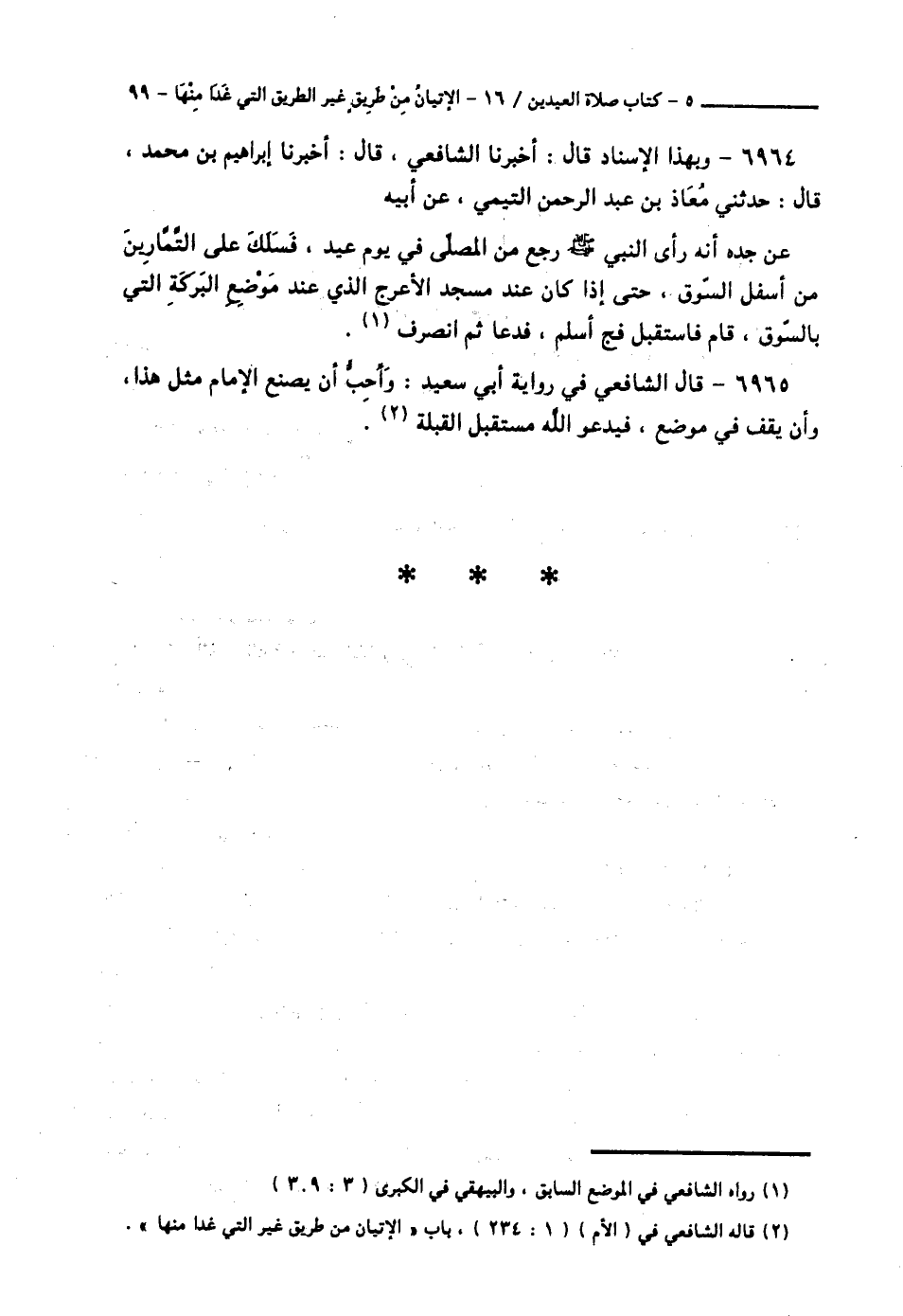 6964 - وَبِهَذَا الْإِسْنَادِ قَالَ: أَخْبَرَنَا الشَّافِعِيُّ قَالَ: أَخْبَرَنَا إِبْرَاهِيمُ بْنُ مُحَمَّدٍ قَالَ: حَدَّثَنِي مُعَاذُ بْنُ عَبْدِ الرَّحْمَنِ التَّيْمِيُّ، عَنْ أَبِيهِ، عَنْ جَدِّهِ، أَنَّهُ «§رَأَى النَّبِيَّ صَلَّى اللهُ عَلَيْهِ وَسَلَّمَ، رَجَعَ مِنَ الْمُصَلَّى فِي يَوْمِ عِيدٍ فَسَلَكَ عَلَى التَّمَّارِينَ مِنْ أَسْفَلَ السُّوقِ حَتَّى إِذَا كَانَ عِنْدَ مَسْجِدِ الْأَعْرَجِ الَّذِي عِنْدَ مَوْضِعِ الْبَرَكَةِ الَّتِي بِالسُّوقِ، قَامَ فَاسْتَقْبَلَ فَجَّ أَسْلَمَ، فَدَعَا ثُمَّ انْصَرَفَ»