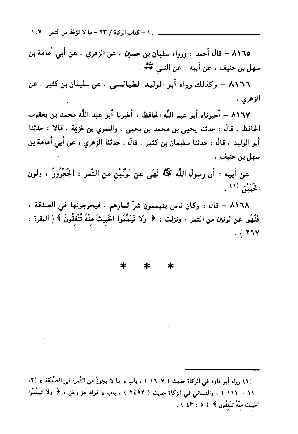 8167 - أَخْبَرَنَاهُ أَبُو عَبْدِ اللَّهِ الْحَافِظُ، أَخْبَرَنَا أَبُو عَبْدِ اللَّهِ مُحَمَّدُ بْنُ يَعْقُوبَ الْحَافِظُ قَالَ: حَدَّثَنَا يَحْيَى بْنُ مُحَمَّدِ بْنِ يَحْيَى، وَالسَّرِيُّ بْنُ خُزَيْمَةَ قَالَا: حَدَّثَنَا أَبُو الْوَلِيدِ قَالَ: حَدَّثَنَا سُلَيْمَانُ بْنُ كَثِيرٍ قَالَ: حَدَّثَنَا الزُّهْرِيُّ، عَنْ أَبِي أُمَامَةَ بْنِ سَهْلِ بْنِ حُنَيْفٍ، عَنْ أَبِيهِ: " أَنَّ §رَسُولَ اللَّهِ صَلَّى اللهُ عَلَيْهِ وَسَلَّمَ نَهَى عَنْ لَوْنَيْنِ مِنَ التَّمْرٍ: الْجُعْرُورِ، وَلَوْنِ الْحُبَيْقِ "