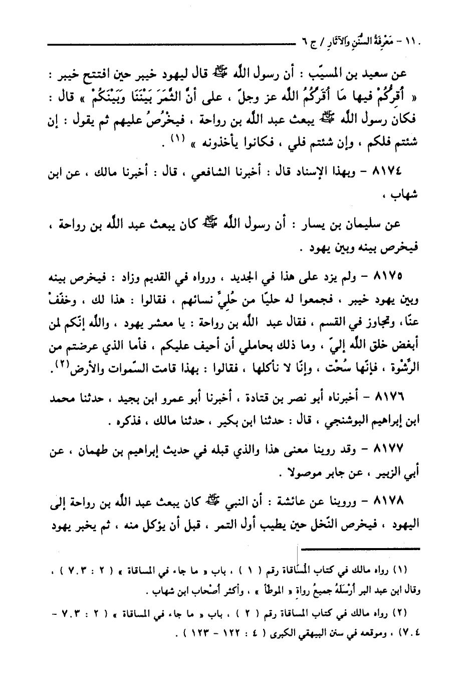 8174 - وَبِهَذَا الْإِسْنَادِ قَالَ: أَخْبَرَنَا الشَّافِعِيُّ قَالَ: أَخْبَرَنَا مَالِكٌ، عَنِ ابْنِ شِهَابٍ، عَنْ سُلَيْمَانَ بْنِ يَسَارٍ: «أَنَّ §رَسُولَ اللَّهِ صَلَّى اللهُ عَلَيْهِ وَسَلَّمَ كَانَ يَبْعَثُ عَبْدَ اللَّهِ بْنِ رَوَاحَةَ، فَيَخْرُصُ بَيْنَهُ وَبَيْنَ يَهُودَ»،