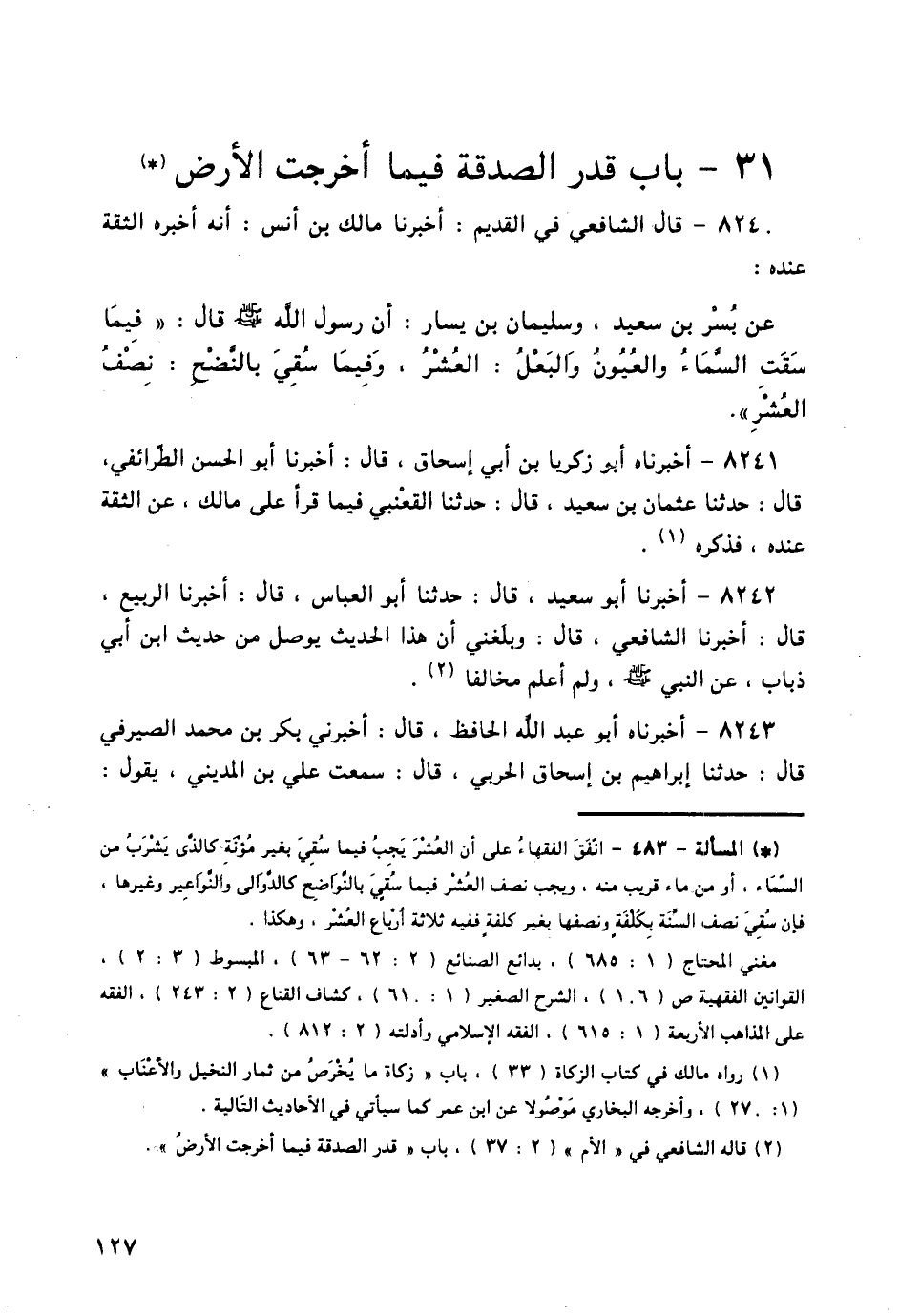 8240 - قَالَ الشَّافِعِيُّ فِي «الْقَدِيمِ»: أَخْبَرَنَا مَالِكُ بْنُ أَنَسٍ: أَنَّهُ أَخْبَرَهُ الثِّقَةُ عِنْدَهُ: عَنْ بُسْرِ بْنِ سَعِيدٍ، وَسُلَيْمَانَ بْنِ يَسَارٍ: أَنَّ رَسُولَ اللَّهِ صَلَّى اللهُ عَلَيْهِ وَسَلَّمَ قَالَ: " §فِيمَا سَقَتِ السَّمَاءُ، وَالْعُيونُ، وَالْبَعْلُ: الْعُشْرُ، وَفِيمَا سُقِيَ بِالنَّضْحِ: نِصْفُ الْعُشْرِ "،