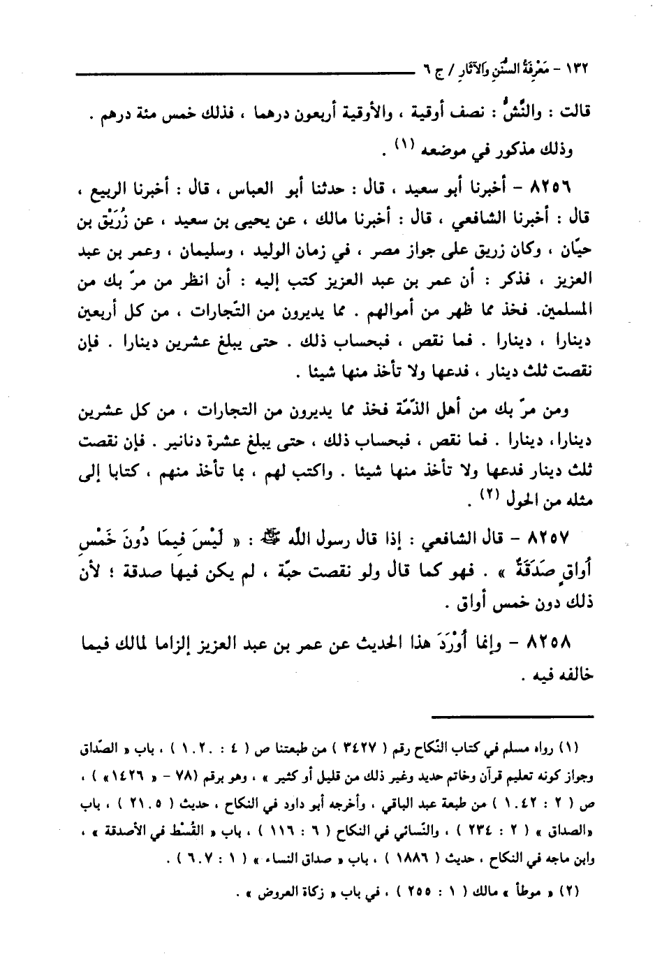 8256 - أَخْبَرَنَا أَبُو سَعِيدٍ قَالَ: حَدَّثَنَا أَبُو الْعَبَّاسِ قَالَ: أَخْبَرَنَا الرَّبِيعُ قَالَ: أَخْبَرَنَا الشَّافِعِيُّ قَالَ: أَخْبَرَنَا مَالِكٌ، عَنْ يَحْيَى بْنِ سَعِيدٍ، عَنْ زُرَيْقِ بْنِ حَيَّانَ، وَكَانَ زُرَيْقٌ عَلَى جَوَازِ مِصْرَ فِي زَمَانِ الْوَلِيدِ، وَسُلَيْمَانَ، وَعُمَرَ بْنِ عَبْدِ الْعَزِيزِ، فَذَكَرَ: أَنَّ عُمَرَ بْنِ عَبْدِ الْعَزِيزِ كَتَبَ إِلَيْهِ: " أَنِ انْظُرْ مَنْ مَرَّ بِكَ مِنَ الْمُسْلِمِينَ §فَخُذْ مِمَّا ظَهْرَ مِنْ أَمْوَالِهِمْ مِمَّا يُدِيرُونَ مِنَ التِّجَارَاتِ، مِنْ كُلِّ أَرْبَعِينَ دِينَارًا، دِينَارًا، فَمَا نَقَصَ فَبِحِسَابِ ذَلِكَ، حَتَّى يَبْلُغَ عِشْرِينَ دِينَارًا، فَإِنْ نَقَصَتْ ثُلُثَ دِينَارٍ، فَدَعْهَا وَلَا تَأْخُذْ مِنْهَا شَيْئًا، وَمَنْ مَرَّ بِكَ مِنْ أَهْلِ الذِّمَّةِ فَخُذْ مِمَّا يُدِيرُونَ مِنَ التِّجَارَاتِ، مِنْ كُلِّ عِشْرِينَ دِينَارًا، دِينَارًا فَمَا نَقَصَ فَبِحِسَابِ ذَلِكَ، حَتَّى يَبْلُغَ عَشْرَةَ دَنَانِيرَ، فَإِنْ نَقَصَتْ ثُلُثَ دِينَارٍ فَدَعْهَا، وَلَا تَأْخُذْ مِنْهَا شَيْئًا، وَاكْتُبْ لَهُمْ، بِمَا تَأْخُذُ مِنْهُمْ كِتَابًا إِلَى مِثْلِهِ مِنَ الْحَوْلِ،