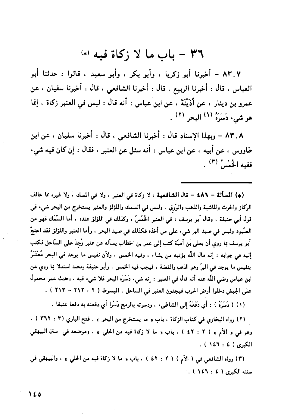 8307 - أَخْبَرَنَا أَبُو زَكَرِيَّا، وَأَبُو بَكْرٍ، وَأَبُو سَعِيدٍ، قَالُوا: حَدَّثَنَا أَبُو الْعَبَّاسِ قَالَ: أَخْبَرَنَا الرَّبِيعُ قَالَ: أَخْبَرَنَا الشَّافِعِيُّ قَالَ: أَخْبَرَنَا سُفْيَانُ، عَنْ عَمْرِو بْنِ دِينَارٍ، عَنْ ابْنِ أُذَيْنَةَ، عَنِ ابْنِ عَبَّاسٍ: أَنَّهُ قَالَ: «§لَيْسَ فِي الْعَنْبَرِ زَكَاةٌ، إِنَّمَا هُوَ شَيْءٌ دَسَرَهُ الْبَحْرُ»