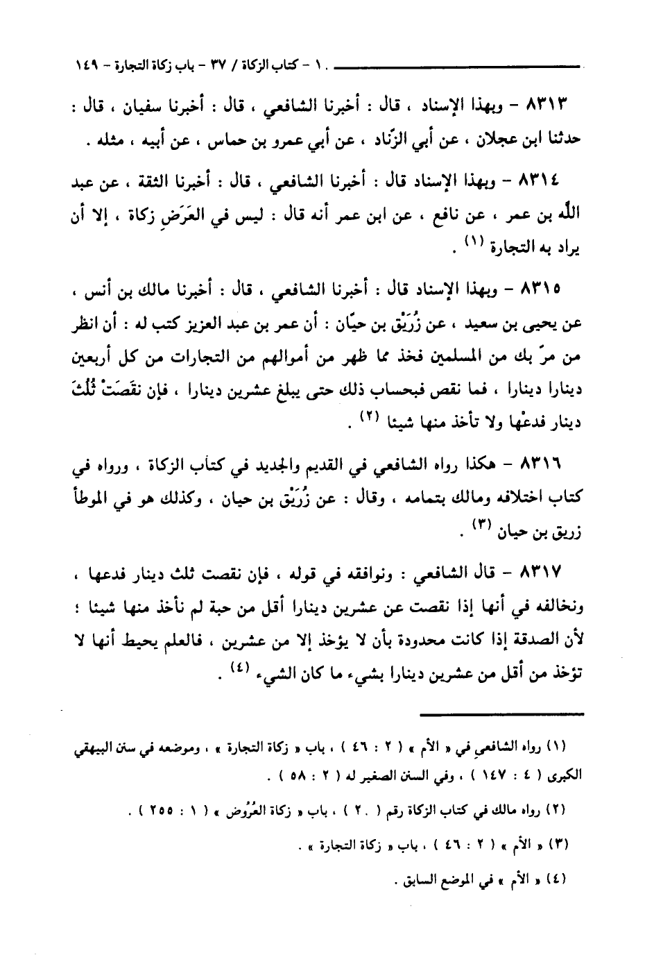 8315 - وَبِهَذَا الْإِسْنَادِ قَالَ: أَخْبَرَنَا الشَّافِعِيُّ قَالَ: أَخْبَرَنَا مَالِكُ بْنُ أَنَسٍ، عَنْ يَحْيَى بْنِ سَعِيدٍ، عَنْ زُرَيْقِ بْنِ حَيَّانَ: أَنَّ عُمَرَ بْنَ عَبْدِ الْعَزِيزِ، كَتَبَ لَهُ: أَنِ §انْظُرْ مِنْ مَرَّ بِكَ مِنَ الْمُسْلِمِينَ فَخُذْ مِمَّا ظَهْرَ مِنْ أَمْوَالِهِمْ مِنَ التِّجَارَاتِ مِنْ كُلِّ أَرْبَعِينَ دِينَارًا، دِينَارًا، فَمَا نَقَصَ فَبِحِسَابِ ذَلِكَ حَتَّى يَبْلُغَ عِشْرِينَ دِينَارًا، فَإِنْ نَقَصَتْ ثُلُثَ دِينَارٍ فَدَعْهَا، وَلَا تَأْخُذْ مِنْهَا شَيْئًا،