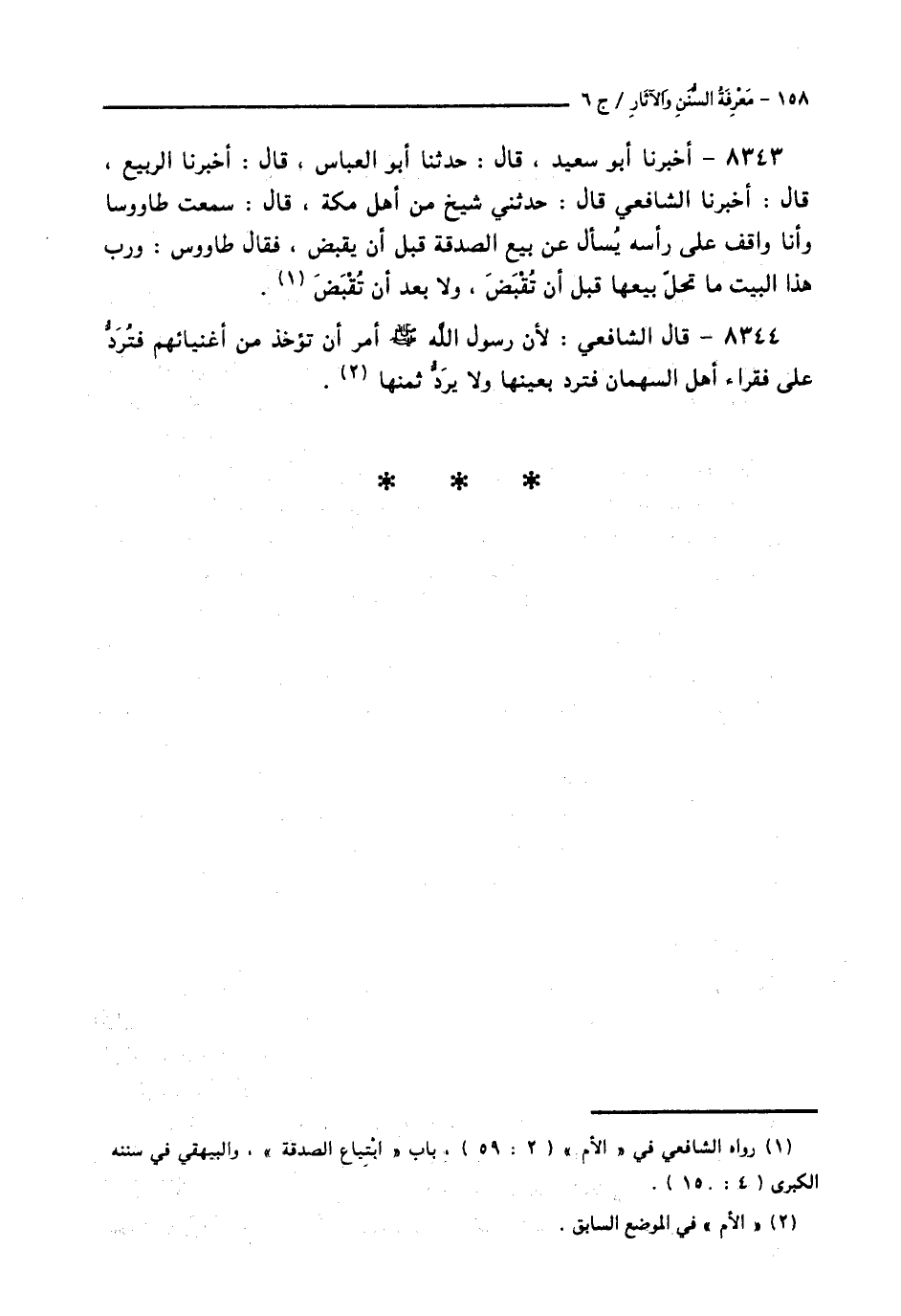 8344 - قَالَ الشَّافِعِيُّ: لِأَنَّ رَسُولَ اللَّهِ صَلَّى اللهُ عَلَيْهِ وَسَلَّمَ أَمَرَ أَنْ تُؤْخَذَ مِنْ أَغْنِيَائِهِمْ فَتُرَدَّ عَلَى فُقَرَاءِ أَهْلِ السُّهْمَانِ، فَتُرَدُّ بِعَيْنِهَا وَلَا يُردُّ ثَمَنُهَا