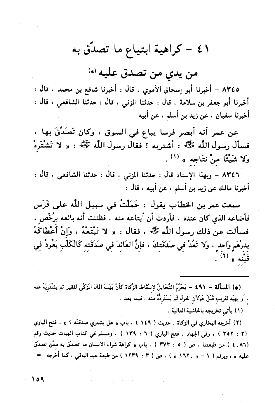 8345 - أَخْبَرَنَا أَبُو إِسْحَاقَ الْأُمَوِيُّ قَالَ: أَخْبَرَنَا شَافِعُ بْنُ مُحَمَّدٍ قَالَ: أَخْبَرَنَا أَبُو جَعْفَرِ بْنُ سَلَامَةَ قَالَ: حَدَّثَنَا الْمُزَنِيُّ قَالَ: حَدَّثَنَا الشَّافِعِيُّ قَالَ: أَخْبَرَنَا سُفْيَانُ، عَنْ زَيْدِ بْنِ أَسْلَمَ، عَنْ أَبِيهِ، عَنْ عُمَرَ، أَنَّهُ أَبْصَرَ فَرَسًا يُبَاعُ فِي السُّوقِ، وَكَانَ تَصَدَّقَ بِهَا، فَسَأَلَ رَسُولَ اللَّهِ صَلَّى اللهُ عَلَيْهِ وَسَلَّمَ: أَشْتَرِيهِ؟ فَقَالَ رَسُولُ اللَّهِ صَلَّى اللهُ عَلَيْهِ وَسَلَّمَ: «§لَا تَشْتَرِهِ، وَلَا شَيْئًا مِنْ نِتَاجِهِ»