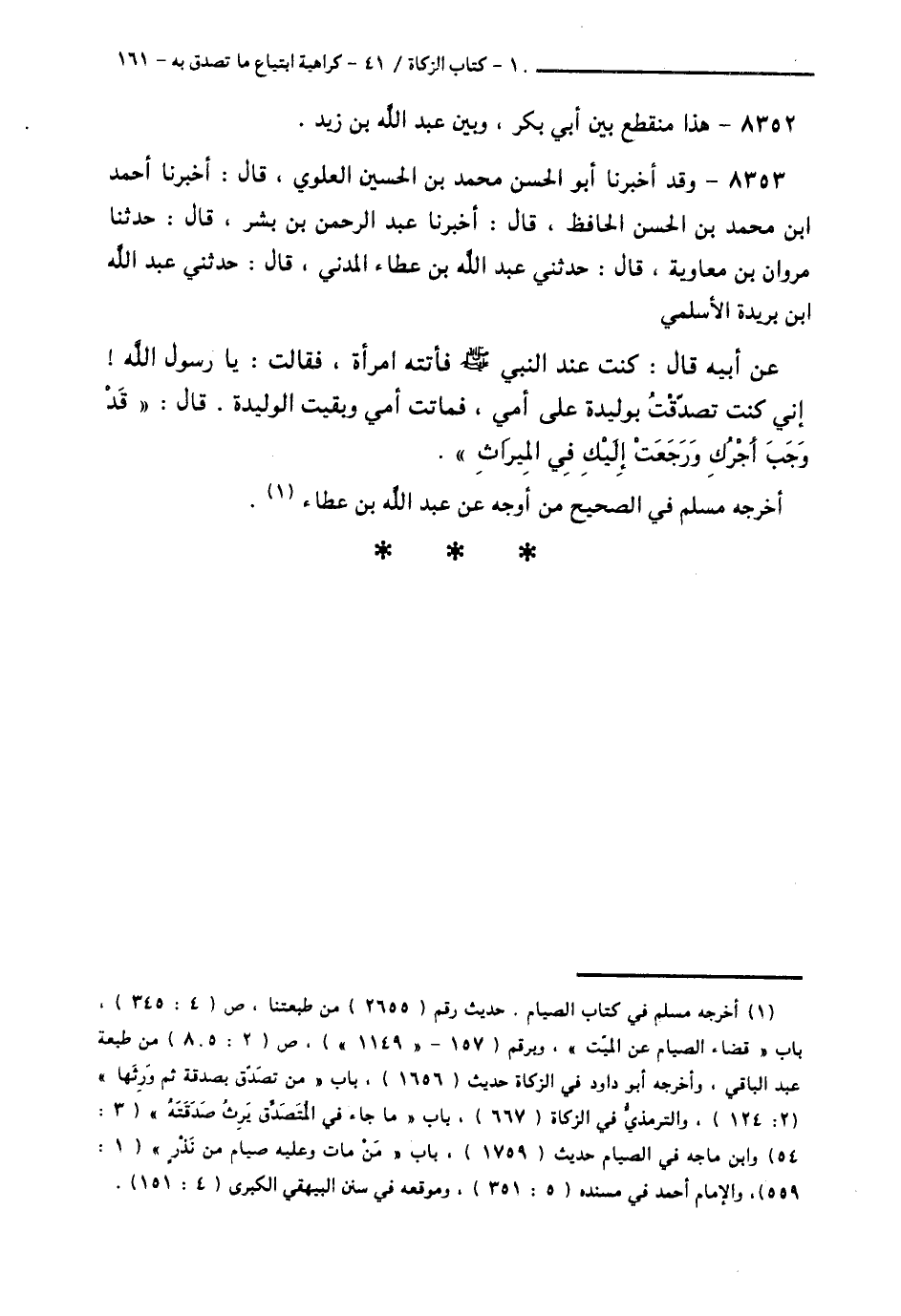 8353 - وَقَدْ أَخْبَرَنَا أَبُو الْحَسَنِ مُحَمَّدُ بْنُ الْحُسَيْنِ الْعَلَوِيُّ قَالَ: أَخْبَرَنَا أَحْمَدُ بْنُ مُحَمَّدِ بْنِ الْحَسَنِ الْحَافِظُ قَالَ: أَخْبَرَنَا عَبْدُ الرَّحْمَنِ بْنُ بِشْرٍ قَالَ: حَدَّثَنَا مَرْوَانُ بْنُ مُعَاوِيَةَ قَالَ: حَدَّثَنِي عَبْدُ اللَّهِ بْنُ عَطَاءٍ الْمَدَنِيُّ قَالَ: حَدَّثَنِي عَبْدُ اللَّهِ بْنُ بُرَيْدَةَ الْأَسْلَمِيُّ، عَنْ أَبِيهِ قَالَ: كُنْتُ عِنْدَ النَّبِيِّ صَلَّى اللهُ عَلَيْهِ وَسَلَّمَ فَأَتَتْهُ امْرَأَةٌ، فَقَالَتْ: يَا رَسُولَ اللَّهِ إِنِّي كُنْتُ §تَصَدَّقْتُ بِوَلِيدَةٍ عَلَى أُمِّي، فَمَاتَتْ أُمِّي وَبَقِيَتِ الْوَلِيدَةُ قَالَ: «قَدْ وَجَبَ أَجْرُكِ، وَرَجَعَتْ إِلَيْكِ فِي الْمِيرَاثِ»، أَخْرَجَهُ مُسْلِمٌ فِي الصَّحِيحِ مِنْ أَوْجُهٍ، عَنْ عَبْدِ اللَّهِ بْنِ عَطَاءٍ