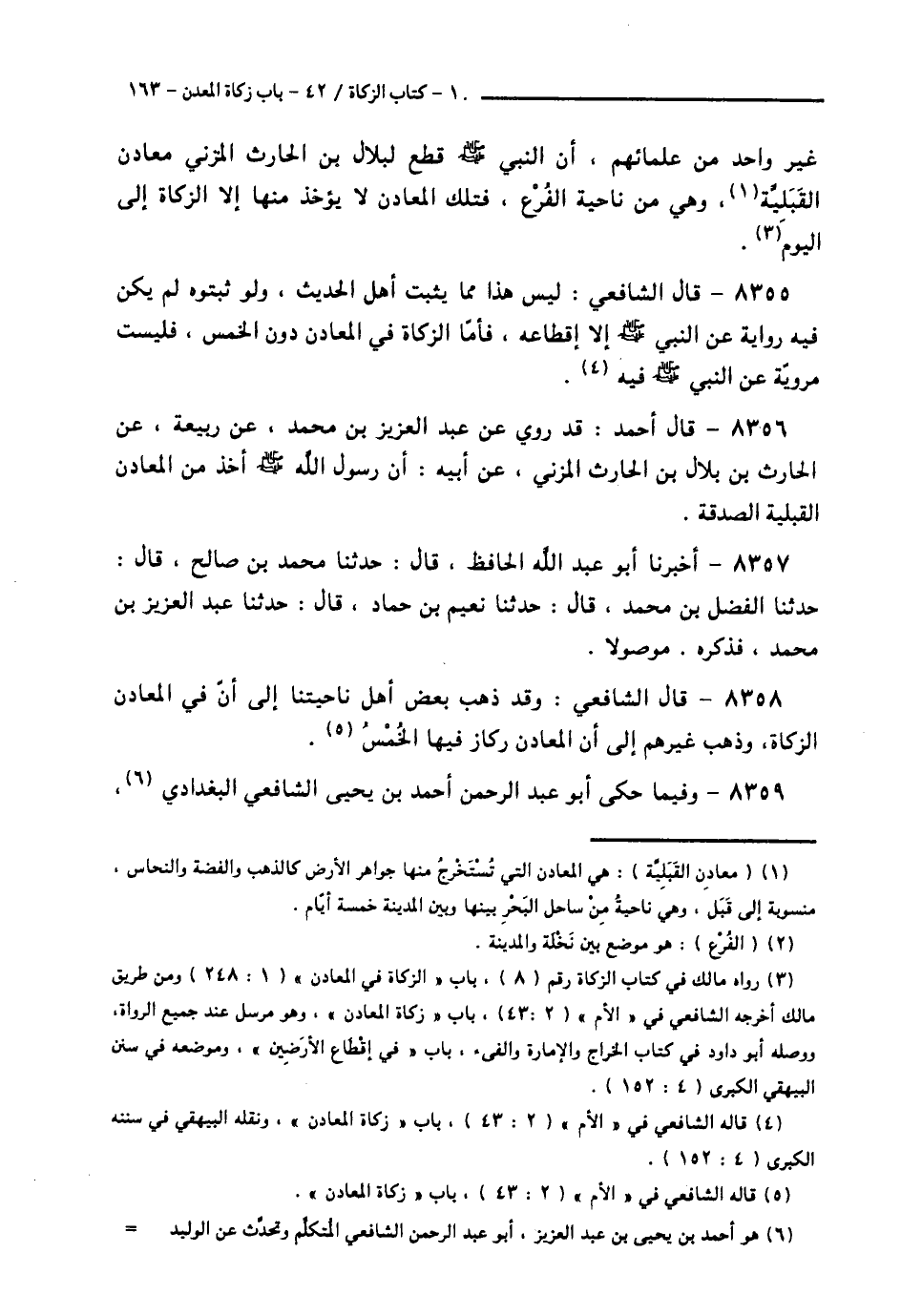 8358 - قَالَ الشَّافِعِيُّ: وَقَدْ ذَهَبَ بَعْضُ أَهْلِ نَاحِيَتِنَا إِلَى أَنَّ فِيَ الْمَعَادِنِ الزَّكَاةَ، وَذَهَبَ غَيْرِهِمْ إِلَى أَنَّ الْمَعَادِنَ رِكَازٌ فِيهَا الْخُمُسُ،