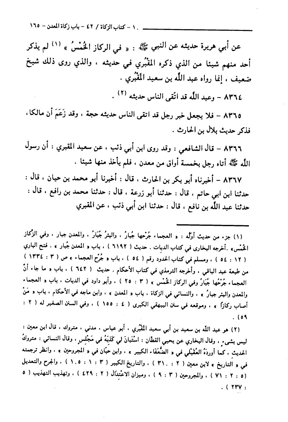8367 - أَخْبَرَنَاهُ أَبُو بَكْرِ بْنُ الْحَارِثِ قَالَ: أَخْبَرَنَا أَبُو مُحَمَّدِ بْنُ حَيَّانَ قَالَ: حَدَّثَنَا ابْنُ أَبِي حَاتِمٍ قَالَ: حَدَّثَنَا أَبُو زُرْعَةَ قَالَ: حَدَّثَنَا مُحَمَّدُ بْنُ رَافِعٍ قَالَ: حَدَّثَنَا عَبْدُ اللَّهِ بْنُ نَافِعٍ قَالَ: حَدَّثَنَا ابْنُ أَبِي ذِئْبٍ، عَنِ الْمَقْبُرِيِّ -[166]-، عَنْ أَبِي هُرَيْرَةَ: أَنَّ §رَجُلًا جَاءَ بِخَمْسَةِ أَوَاقٍ إِلَى رَسُولِ اللَّهِ صَلَّى اللهُ عَلَيْهِ وَسَلَّمَ، فَقَالَ: يَا رَسُولَ اللَّهِ صَلَّى اللهُ عَلَيْهِ وَسَلَّمَ إِنِّي أَصَبْتُ هَذَا مِنْ مَعْدِنٍ، فَخُذْ مِنْهُ الزَّكَاةَ قَالَ: «لَا شَيْءَ فِيهِ» وَرَدَّهُ