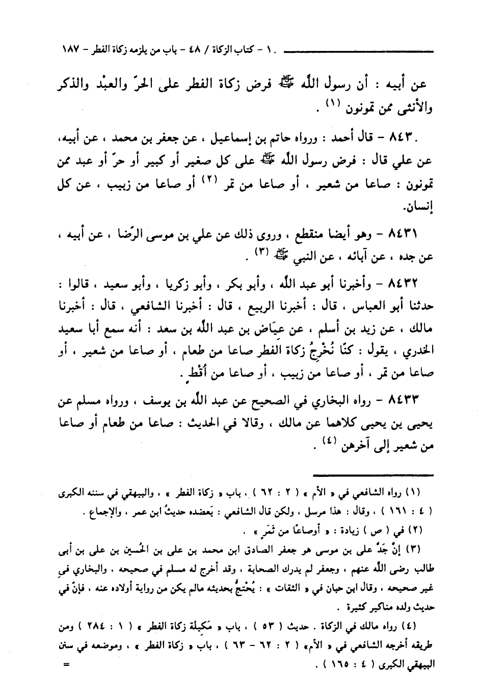 8433 - رَوَاهُ الْبُخَارِيُّ فِي الصَّحِيحِ، عَنْ عَبْدِ اللَّهِ بْنِ يُوسُفَ، وَرَوَاهُ مُسْلِمٌ، عَنْ يَحْيَى بْنِ يَحْيَى، كِلَاهُمَا، عَنْ مَالِكٍ، وَقَالَا فِي الْحَدِيثِ: صَاعًا مِنْ طَعَامٍ، أَوْ صَاعًا مِنْ شَعِيرٍ إِلَى آخِرِهِنَّ -[188]-