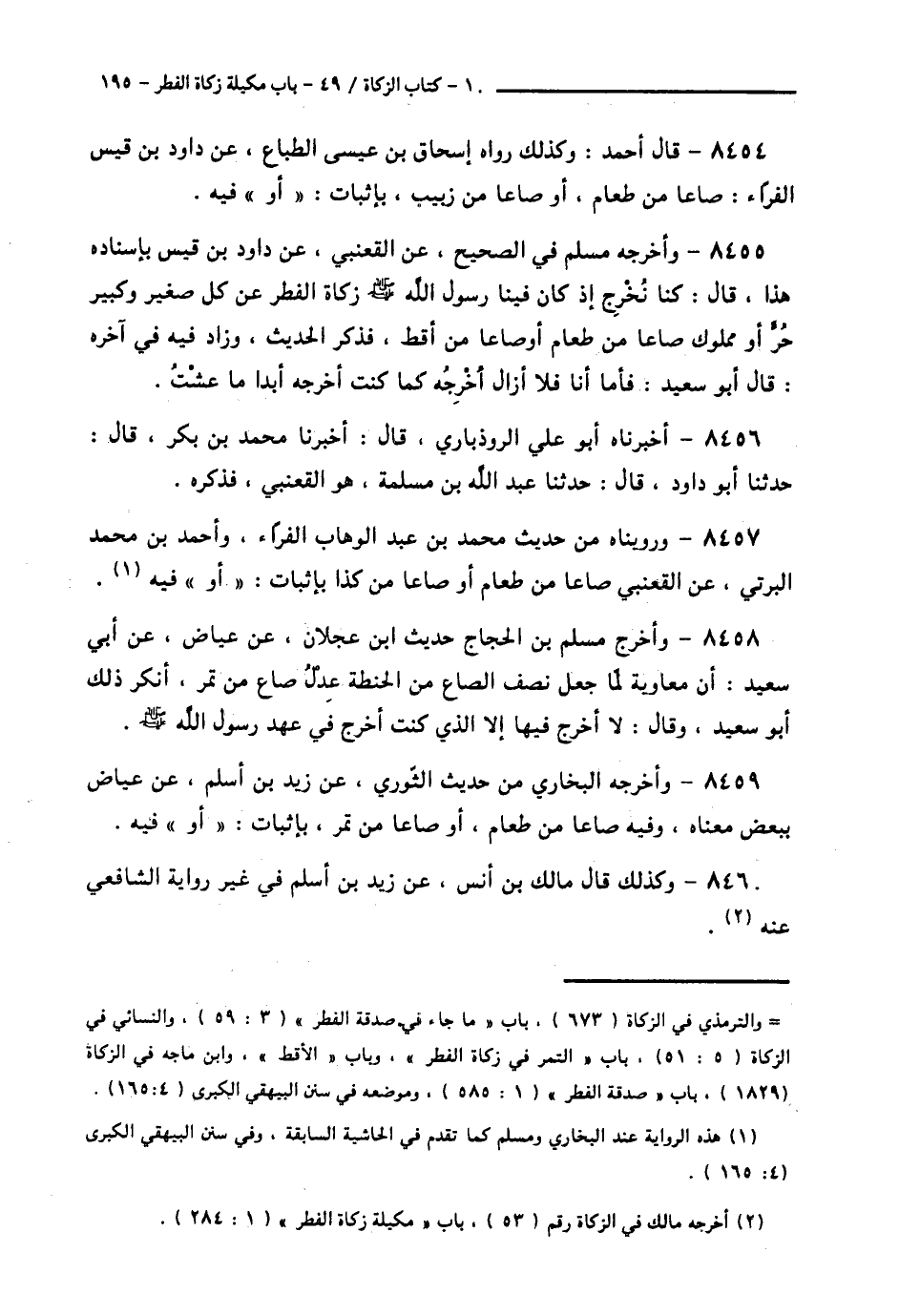 8458 - وَأَخْرَجَ مُسْلِمُ بْنُ الْحَجَّاجِ حَدِيثَ ابْنِ عَجْلَانَ، عَنْ عِيَاضٍ، عَنْ أَبِي سَعِيدٍ: أَنَّ مُعَاوِيَةَ لَمَّا جَعَلَ نِصْفَ الصَّاعِ مِنَ الْحِنْطَةِ، عِدْلَ صَاعٍ مِنْ تَمْرٍ، أَنْكَرَ ذَلِكَ أَبُو سَعِيدٍ، وَقَالَ: § «لَا أُخْرِجُ فِيهَا إِلَّا الَّذِي كُنْتُ أُخْرِجُ فِي عَهْدِ رَسُولِ اللَّهِ صَلَّى اللهُ عَلَيْهِ وَسَلَّمَ»،