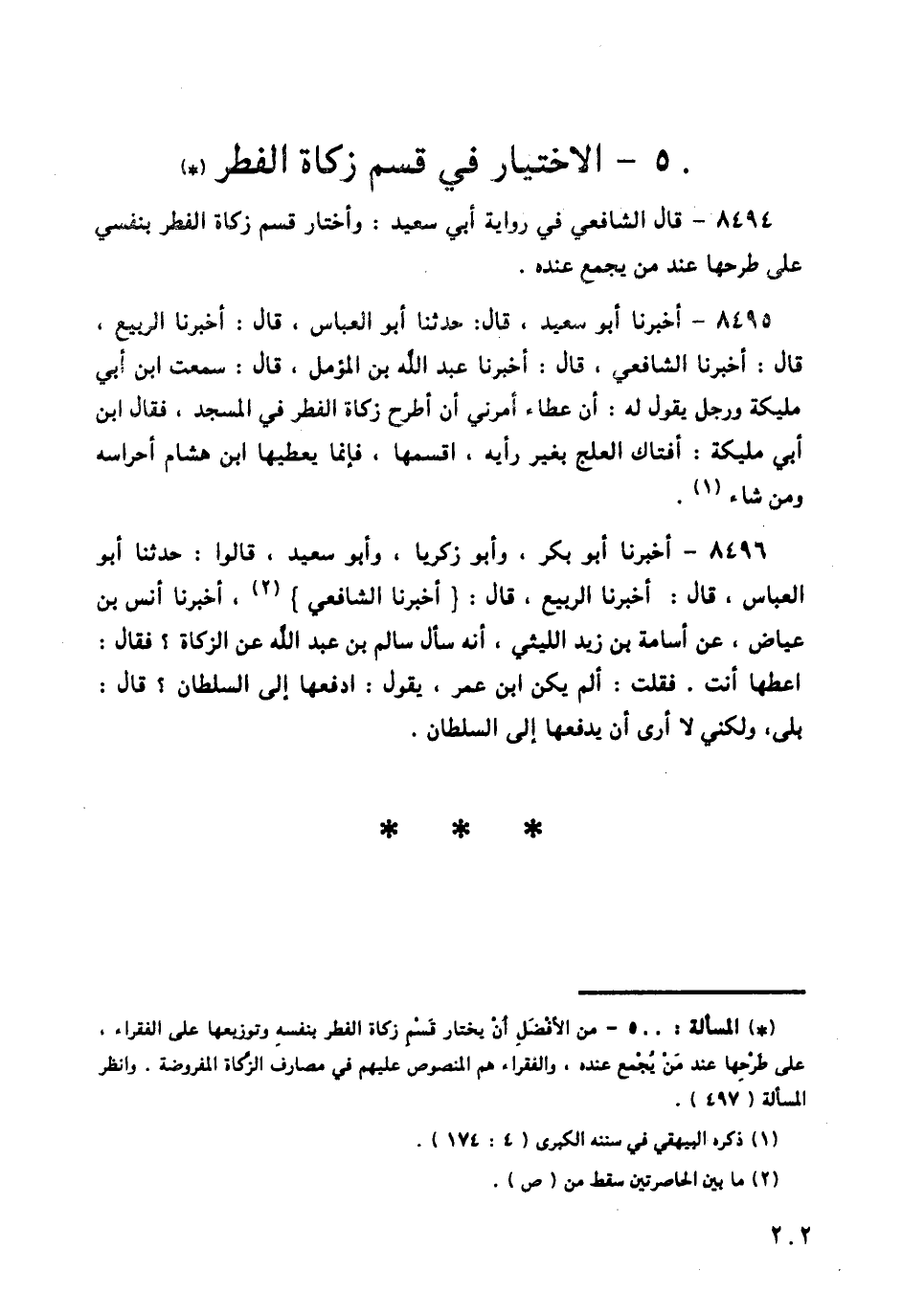 8496 - أَخْبَرَنَا أَبُو بَكْرٍ، وَأَبُو زَكَرِيَّا، وَأَبُو سَعِيدٍ، قَالُوا: حَدَّثَنَا أَبُو الْعَبَّاسِ قَالَ: أَخْبَرَنَا الرَّبِيعَ قَالَ: أَخْبَرَنَا الشَّافِعِيُّ، أَخْبَرَنَا أَنَسُ بْنُ عِيَاضٍ، عَنْ أُسَامَةَ بْنِ زَيْدٍ اللَّيْثِيِّ: أَنَّهُ سَأَلَ سَالِمَ بْنَ عَبْدِ اللَّهِ، عَنِ الزَّكَاةِ؟ فَقَالَ: اعْطِهَا أَنْتَ، فَقُلْتُ: أَلَمْ يَكُنِ ابْنُ عُمَرَ يَقُولُ: " §ادْفَعْهَا إِلَى السُّلْطَانِ؟ قَالَ: بَلَى، وَلَكِنِّي لَا أَرَى أَنْ يَدْفَعَهَا إِلَى السُّلْطَانِ "