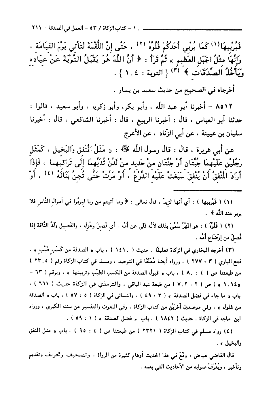 8512 - أَخْبَرَنَا أَبُو عَبْدِ اللَّهِ، وَأَبُو بَكْرٍ، وَأَبُو زَكَرِيَّا، وَأَبُو سَعِيدٍ، قَالُوا: حَدَّثَنَا أَبُو الْعَبَّاسِ قَالَ: أَخْبَرَنَا الرَّبِيعُ قَالَ: أَخْبَرَنَا الشَّافِعِيُّ قَالَ: أَخْبَرَنَا سُفْيَانُ بْنُ عُيَيْنَةَ، عَنْ أَبِي الزِّنَادِ، عَنِ الْأَعْرَجِ، عَنْ أَبِي هُرَيْرَةَ قَالَ: قَالَ رَسُولُ اللَّهِ صَلَّى اللهُ عَلَيْهِ وَسَلَّمَ: «§مَثَلُ الْمُنْفِقِ وَالْبَخِيلِ، كَمَثَلِ رَجُلَيْنِ عَلَيْهِمَا جُبَّتَانِ، أَوْ جُنَّتَانِ مِنْ حَدِيدٍ مِنْ لَدُنْ ثُدَيِّهِمَا إِلَى تَرَاقِيهِمَا، فَإِذَا أَرَادَ الْمُنْفِقُ أَنْ يُنْفِقَ سَبَغَتْ عَلَيْهِ الدِّرْعُ، أَوْ مَرَّتْ حَتَّى تُجِنَّ بَنَانَهُ، أَوْ -[212]- تَعْفُوَ أَثَرَهُ، فَإِذَا أَرَادَ الْبَخِيلُ أَنْ يُنْفِقَ قَلَصَتْ، وَلَزِمَتْ كُلُّ حَلْقَةٍ مَوْضِعَهَا، حَتَّى تَأْخُذَ بِعُنُقِهِ، أَوْ تَرْقَوَتِهِ، فَهُوَ يُوَسِّعُهَا وَلَا تَتَّسِعُ»،