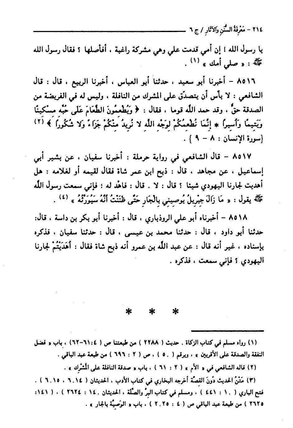8516 - أَخْبَرَنَا أَبُو سَعِيدٍ، حَدَّثَنَا أَبُو الْعَبَّاسِ، أَخْبَرَنَا الرَّبِيعُ قَالَ: قَالَ الشَّافِعِيُّ: §" لَا بَأْسَ أَنْ يُتَصَدَّقَ عَلَى الْمُشْرِكِ مِنَ النَّافِلَةِ، وَلَيْسَ لَهُ فِي الْفَرِيضَةِ مِنَ الصَّدَقَةِ حَقٌّ، وَقَدْ حَمِدَ اللَّهُ قَوْمًا، فَقَالَ: {وَيُطْعِمُونَ الطَّعَامَ عَلَى حُبِّهِ مِسْكِينًا وَيَتِيمًا وَأَسِيرًا، إِنَّمَا نُطْعِمُكُمْ لِوَجْهِ اللَّهِ لَا نُرِيدُ مِنْكُمْ جَزَاءً وَلَا شُكُورًا} [الإنسان: 9] "