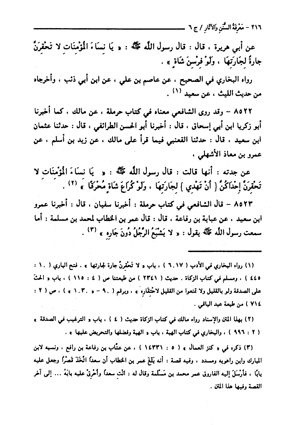 8523 - قَالَ الشَّافِعِيُّ فِي كِتَابِ حَرْمَلَةَ: أَخْبَرَنَا سُفْيَانُ قَالَ: أَخْبَرَنَا عَمْرُو بْنُ سَعِيدٍ، عَنْ عَبَايَةَ بْنِ رِفَاعَةَ قَالَ: قَالَ عُمَرُ بْنُ الْخَطَّابِ لِمُحَمَّدِ بْنِ مَسْلَمَةَ: أَمَا سَمِعْتُ رَسُولَ اللَّهِ صَلَّى اللهُ عَلَيْهِ وَسَلَّمَ، يَقُولُ: § «لَا يَشْبَعُ الرَّجُلُ دُونَ جَارِهِ» -[217]-.