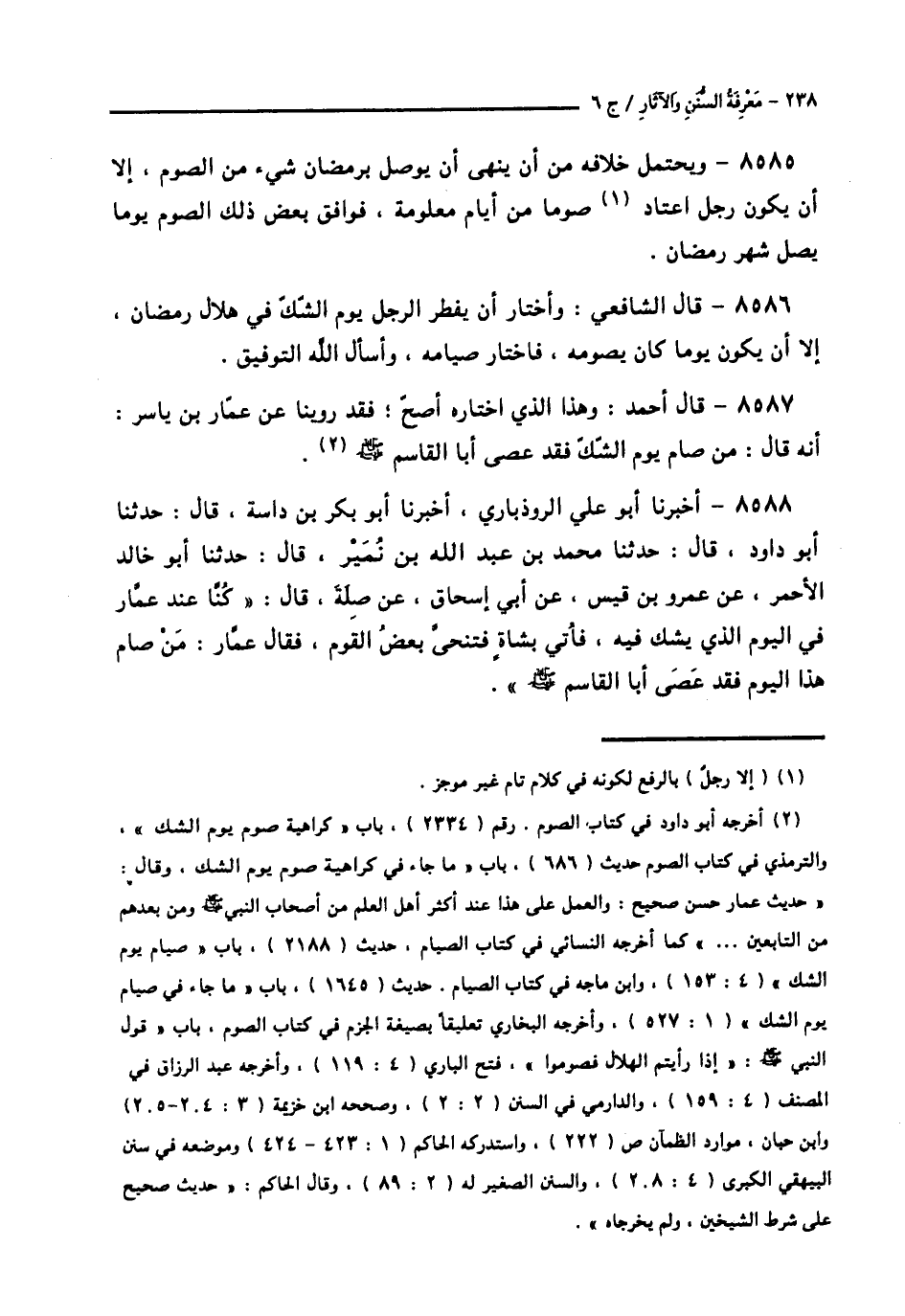 8588 - أَخْبَرَنَا أَبُو عَلِيٍّ الرُّوذْبَارِيُّ، أَخْبَرَنَا أَبُو بَكْرِ بْنُ دَاسَةَ قَالَ: حَدَّثَنَا أَبُو دَاوُدَ قَالَ: حَدَّثَنَا مُحَمَّدُ بْنُ عَبْدِ اللَّهِ بْنِ نُمَيْرٍ قَالَ: حَدَّثَنَا أَبُو خَالِدٍ الْأَحْمَرُ، عَنْ عَمْرِو بْنِ قَيْسٍ، عَنْ أَبِي إِسْحَاقَ، عَنْ صِلَةَ قَالَ: كُنَّا عِنْدَ عَمَّارٍ فِي الْيَوْمِ الَّذِي يُشَكُّ فِيهِ، فَأُتِيَ بِشَاةٍ فَتَنَحَّى بَعْضُ الْقَوْمِ، فَقَالَ عَمَّارُ: § «مَنْ صَامَ هَذَا الْيَوْمَ فَقَدْ عَصَى أَبَا الْقَاسِمِ صَلَّى اللهُ عَلَيْهِ وَسَلَّمَ» -[239]-،