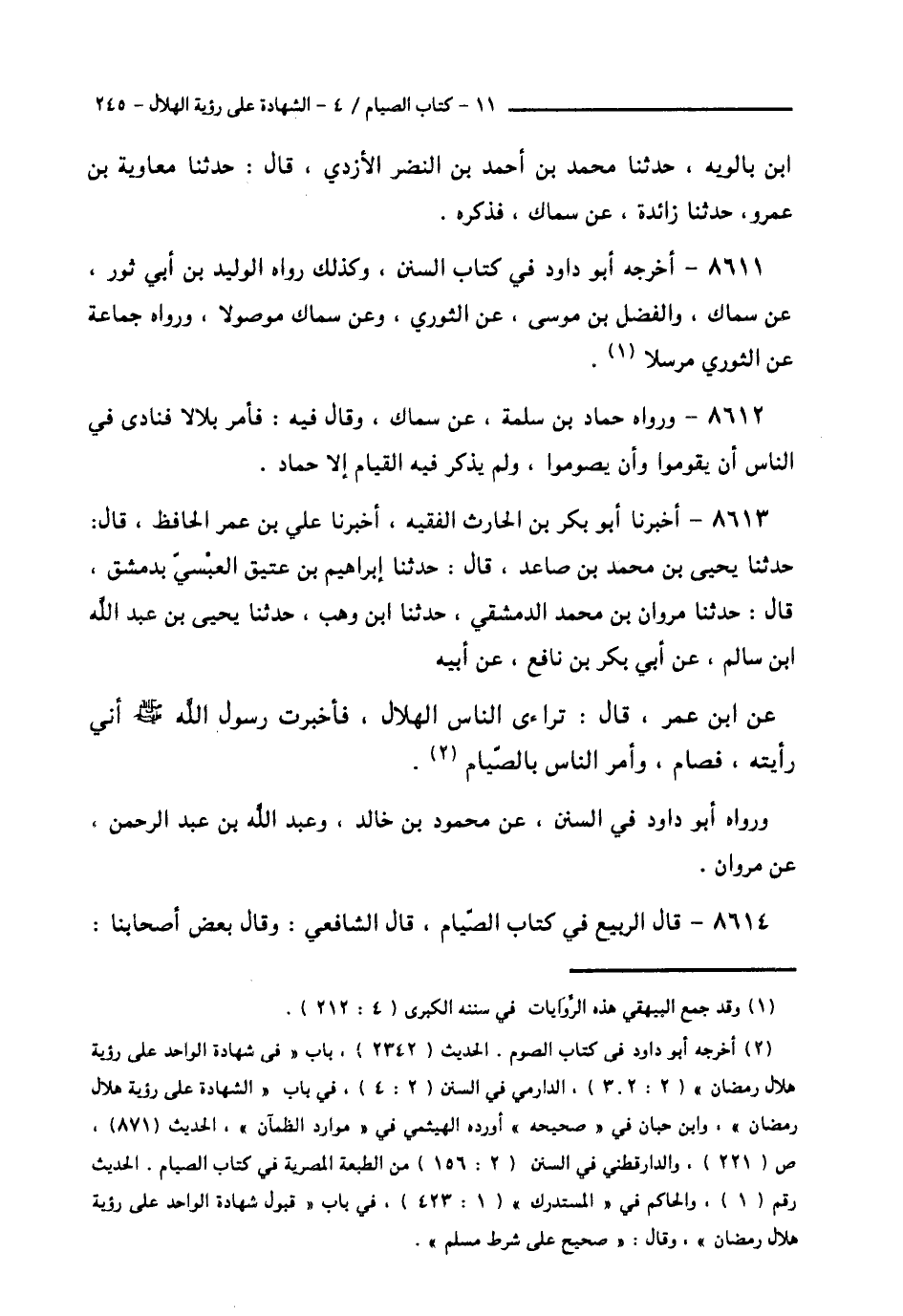 8613 - أَخْبَرَنَا أَبُو بَكْرِ بْنُ الْحَارِثِ الْفَقِيهُ، أَخْبَرَنَا عَلِيُّ بْنُ عُمَرَ الْحَافِظُ قَالَ: حَدَّثَنَا يَحْيَى بْنُ مُحَمَّدِ بْنِ صَاعِدٍ قَالَ: حَدَّثَنَا إِبْرَاهِيمُ بْنُ عَتِيقٍ الْعَبْسِيُّ، بِدِمَشْقَ قَالَ: حَدَّثَنَا مَرْوَانُ بْنُ مُحَمَّدٍ الدِّمَشْقِيُّ، حَدَّثَنَا ابْنُ وَهْبٍ، حَدَّثَنَا يَحْيَى بْنُ عَبْدِ اللَّهِ بْنِ سَالِمٍ، عَنْ أَبِي بَكْرِ بْنِ نَافِعٍ، عَنْ أَبِيهِ، عَنِ ابْنِ عُمَرَ قَالَ: «§تَرَاءَى النَّاسُ الْهِلَالَ، فَأَخْبَرْتُ رَسُولَ اللَّهِ صَلَّى اللهُ عَلَيْهِ وَسَلَّمَ أَنِّي رَأَيْتُهُ، فَصَامَ وَأَمَرَ النَّاسَ بِالصِّيَامِ» وَرَوَاهُ أَبُو دَاوُدَ فِي السُّنَنِ، عَنْ مَحْمُودِ بْنِ خَالِدٍ، وَعَبْدِ اللَّهِ بْنِ عَبْدِ الرَّحْمَنِ، عَنْ مَرْوَانَ