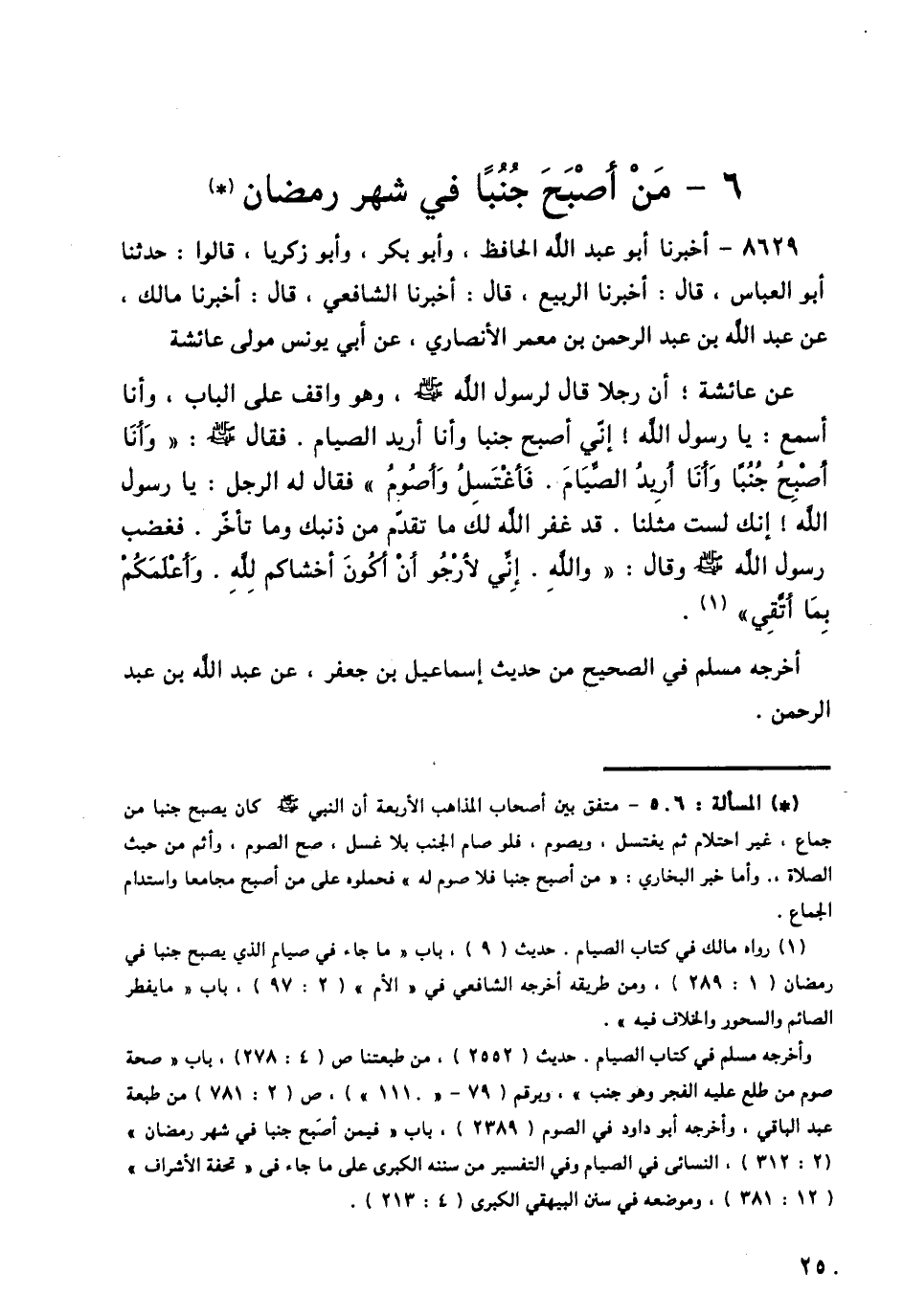 8629 - أَخْبَرَنَا أَبُو عَبْدِ اللَّهِ الْحَافِظُ، وَأَبُو بَكْرٍ، وَأَبُو زَكَرِيَّا، قَالُوا: حَدَّثَنَا أَبُو الْعَبَّاسِ قَالَ: أَخْبَرَنَا الرَّبِيعُ قَالَ: أَخْبَرَنَا الشَّافِعِيُّ قَالَ: أَخْبَرَنَا مَالِكٌ، عَنْ عَبْدِ اللَّهِ بْنِ عَبْدِ الرَّحْمَنِ بْنِ مَعْمَرٍ الْأَنْصَارِيِّ، عَنْ أَبِي يُونُسَ، مَوْلَى عَائِشَةَ عَنْ عَائِشَةَ، أَنَّ رَجُلًا قَالَ لِرَسُولِ اللَّهِ صَلَّى اللهُ عَلَيْهِ وَسَلَّمَ، وَهُوَ وَاقِفٌ عَلَى الْبَابِ، وَأَنَا أَسْمَعُ: يَا رَسُولَ اللَّهِ إِنِّي أُصْبِحُ جُنُبًا، وَأَنَا أُرِيدُ الصِّيَامَ، فَقَالَ صَلَّى اللهُ عَلَيْهِ وَسَلَّمَ: «§وَأَنَا أُصْبِحُ جُنُبًا، وَأَنَا أُرِيدُ الصِّيَامَ فَأَغْتَسِلُ وَأَصُومُ»، فَقَالَ لَهُ الرَّجُلُ: يَا رَسُولَ اللَّهِ إِنَّكَ لَسْتَ مِثْلَنَا قَدْ غَفَرَ اللَّهُ لَكَ مَا تَقَدَّمَ مِنْ ذَنْبِكَ وَمَا تَأَخَّرَ، فَغَضِبَ رَسُولُ اللَّهِ صَلَّى اللهُ عَلَيْهِ وَسَلَّمَ، وَقَالَ: «وَاللَّهِ إِنِّي لَأَرْجُو أَنْ أَكُونَ أَخْشَاكُمْ لِلَّهِ، وَأَعْلَمَكُمْ بِمَا أَتَّقِي»، أَخْرَجَهُ مُسْلِمٌ فِي الصَّحِيحِ مِنْ حَدِيثِ إِسْمَاعِيلَ بْنِ جَعْفَرٍ، عَنْ عَبْدِ اللَّهِ بْنِ عَبْدِ الرَّحْمَنِ