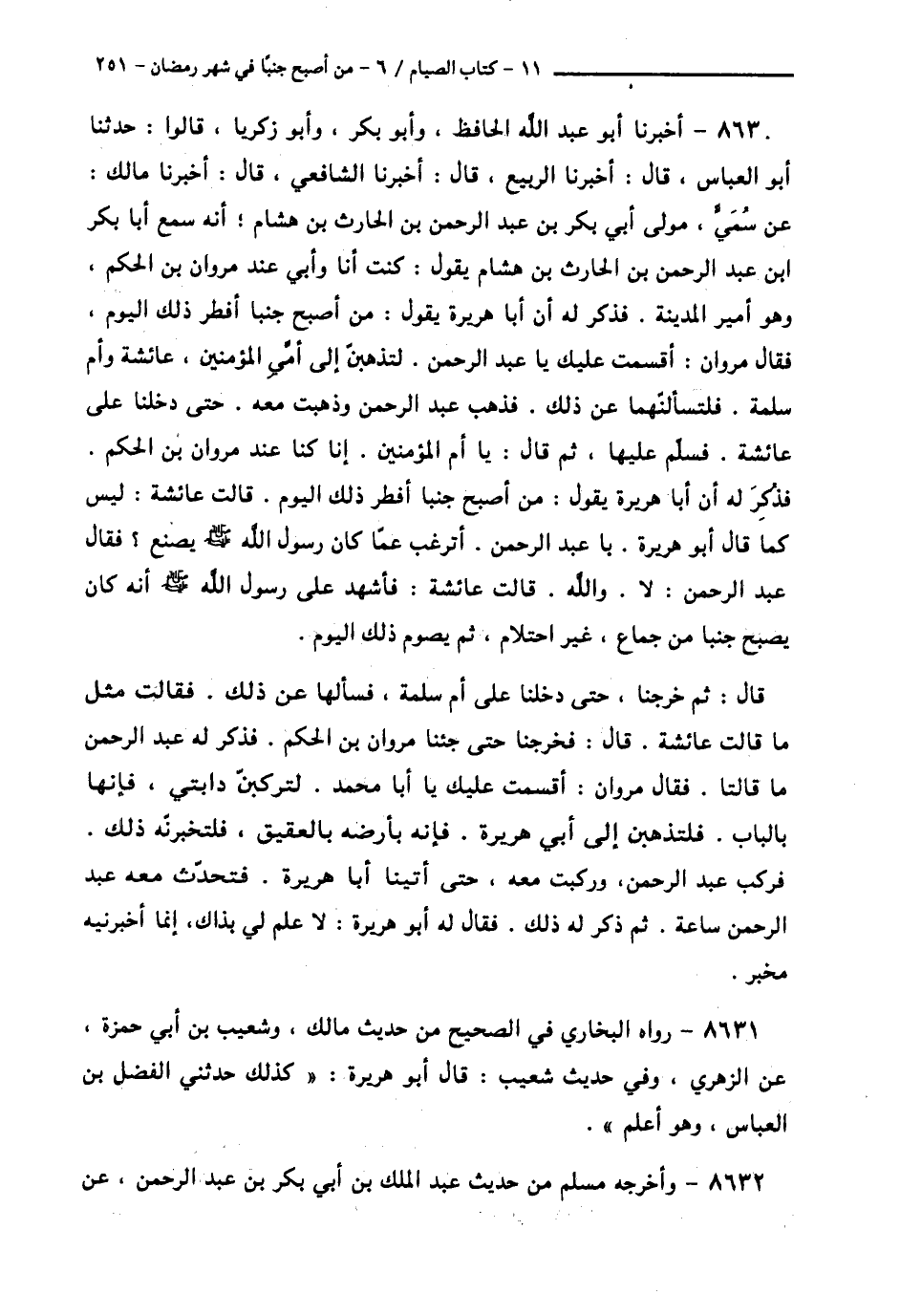 8630 - أَخْبَرَنَا أَبُو عَبْدِ اللَّهِ الْحَافِظُ، وَأَبُو بَكْرٍ، وَأَبُو زَكَرِيَّا، قَالُوا: حَدَّثَنَا أَبُو الْعَبَّاسِ قَالَ: أَخْبَرَنَا الرَّبِيعُ قَالَ: أَخْبَرَنَا الشَّافِعِيُّ قَالَ: أَخْبَرَنَا مَالِكٌ، عَنْ سُمَيٍّ مَوْلَى أَبِي بَكْرِ بْنِ عَبْدِ الرَّحْمَنِ بْنِ الْحَارِثِ بْنِ هِشَامٍ، أَنَّهُ سَمِعَ أَبَا بَكْرِ بْنِ عَبْدِ الرَّحْمَنِ بْنِ الْحَارِثِ بْنِ هِشَامٍ، يَقُولُ: كُنْتُ أَنَا وَأَبِي عِنْدَ مَرْوَانَ بْنِ الْحَكَمِ، وَهُوَ أَمِيرُ الْمَدِينَةِ فَذَكَرَ لَهُ أَنَّ أَبَا هُرَيْرَةَ، يَقُولُ: مَنْ أَصْبَحَ جُنُبًا أَفْطَرَ ذَلِكَ الْيَوْمَ، فَقَالَ: مَرْوَانُ: أَقْسَمْتُ عَلَيْكَ يَا عَبْدَ الرَّحْمَنِ لَتَذْهَبَنَّ إِلَى أُمَّيِ الْمُؤْمِنِينَ، عَائِشَةَ وَأُمِّ سَلَمَةَ، فَلْتَسْأَلَنَّهُمَا عَنْ ذَلِكَ، فَذَهَبَ عَبْدُ الرَّحْمَنِ، وَذَهَبْتُ مَعَهُ حَتَّى دَخَلْنَا عَلَى عَائِشَةَ فَسَلَّمَ عَلَيْهَا، ثُمَّ قَالَ: يَا أُمَّ الْمُؤْمِنِينَ إِنَّا كُنَّا عِنْدَ مَرْوَانَ بْنِ الْحَكَمِ فَذُكِرَ لَهُ أَنَّ أَبَا هُرَيْرَةَ يَقُولُ: مَنْ أَصْبَحَ جُنُبًا أَفْطَرَ ذَلِكَ الْيَوْمَ قَالَتْ عَائِشَةُ: لَيْسَ كَمَا قَالَ أَبُو هُرَيْرَةَ، يَا عَبْدَ الرَّحْمَنِ، أَتَرْغَبُ عَمَّا كَانَ رَسُولُ اللَّهِ صَلَّى اللهُ عَلَيْهِ وَسَلَّمَ يَصْنَعُ؟ فَقَالَ عَبْدُ الرَّحْمَنِ: لَا وَاللَّهِ قَالَتْ عَائِشَةُ: «فَأَشْهَدُ عَلَى رَسُولِ اللَّهِ صَلَّى اللهُ عَلَيْهِ وَسَلَّمَ أَنَّهُ §كَانَ يُصْبِحُ جُنُبًا مِنْ جِمَاعٍ غَيْرِ احْتِلَامٍ، ثُمَّ يَصُومُ ذَلِكَ الْيَوْمَ» قَالَ: ثُمَّ خَرَجْنَا، حَتَّى دَخَلْنَا عَلَى أُمِّ سَلَمَةَ، فَسَأَلَهَا عَنْ ذَلِكَ فَقَالَتْ مِثْلَ مَا قَالَتْ عَائِشَةُ قَالَ: فَخَرَجْنَا حَتَّى جِئْنَا مَرْوَانَ بْنَ الْحَكَمِ فَذَكَرَ لَهُ عَبْدُ الرَّحْمَنِ مَا قَالَتَا، فَقَالَ مَرْوَانُ: أَقْسَمْتُ عَلَيْكَ يَا أَبَا مُحَمَّدٍ لَتَرْكَبَنَّ دَابَّتِي فَإِنَّهَا بِالْبَابِ فَلْتَذْهَبَنَّ إِلَى أَبِي هُرَيْرَةَ، فَإِنَّهُ بِأَرْضِهِ بِالْعَقِيقِ، فَلَتُخْبِرَنَّهُ ذَلِكَ، فَرَكِبَ عَبْدُ الرَّحْمَنِ، وَرَكِبْتُ مَعَهُ، حَتَّى أَتَيْنَا أَبَا هُرَيْرَةَ فَتَحَدَّثَ مَعَهُ عَبْدُ الرَّحْمَنِ سَاعَةً ثُمَّ ذَكَرَ لَهُ ذَلِكَ، فَقَالَ لَهُ أَبُو هُرَيْرَةَ: لَا عِلْمَ لِي بِذَاكَ، إِنَّمَا أَخْبَرَنِيهِ مُخْبِرٌ،
