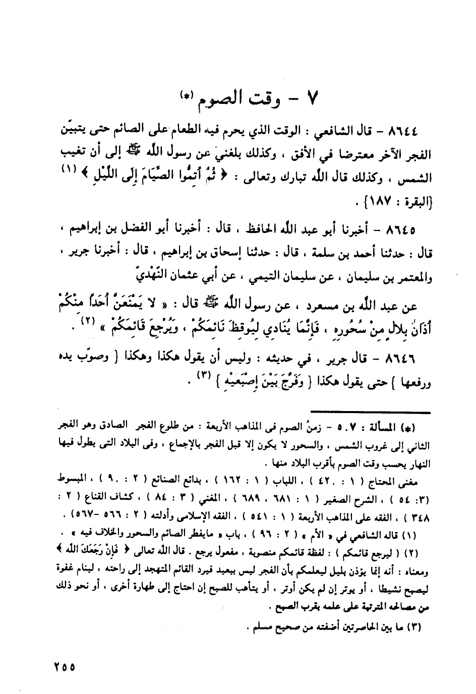 8645 - أَخْبَرَنَا أَبُو عَبْدِ اللَّهِ الْحَافِظُ قَالَ: أَخْبَرَنَا أَبُو الْفَضْلِ بْنُ إِبْرَاهِيمَ قَالَ: حَدَّثَنَا أَحْمَدُ بْنُ سَلَمَةَ قَالَ: حَدَّثَنَا إِسْحَاقُ بْنُ إِبْرَاهِيمَ قَالَ: أَخْبَرَنَا جَرِيرٌ، وَالْمُعْتَمِرُ بْنُ سُلَيْمَانَ، عَنْ سُلَيْمَانَ التَّيْمِيِّ، عَنْ أَبِي عُثْمَانَ النَّهْدِيِّ، عَنْ عَبْدِ اللَّهِ بْنِ مَسْعُودٍ، عَنْ رَسُولِ اللَّهِ صَلَّى اللهُ عَلَيْهِ وَسَلَّمَ قَالَ: «§لَا يَمْنَعَنَّ أَحَدًا مِنْكُمْ أَذَانُ بِلَالٍ مِنْ سَحُورِهِ، فَإِنَّمَا يُنَادِي لِيُوقِظَ نَائِمَكُمْ، وَيُرْجِعَ قَائِمَكُمْ»،