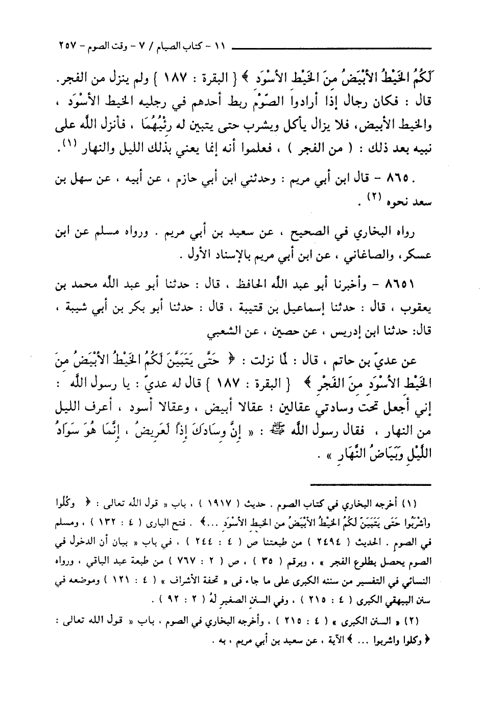 8651 - وَأَخْبَرَنَا أَبُو عَبْدِ اللَّهِ الْحَافِظُ قَالَ: حَدَّثَنَا أَبُو عَبْدِ اللَّهِ مُحَمَّدُ بْنُ يَعْقُوبَ قَالَ: حَدَّثَنَا إِسْمَاعِيلُ بْنُ قُتَيْبَةَ قَالَ: حَدَّثَنَا أَبُو بَكْرِ بْنُ أَبِي شَيْبَةَ قَالَ: حَدَّثَنَا ابْنُ إِدْرِيسَ، عَنْ حُصَيْنٍ، عَنِ الشَّعْبِيِّ، عَنْ عَدِيِّ بْنِ حَاتِمٍ قَالَ: لَمَّا نَزَلَتْ: {حَتَّى يَتَبَيَّنَ لَكُمُ الْخَيْطُ الْأَبْيَضُ مِنَ الْخَيْطِ الْأَسْوَدِ مِنَ الْفَجْرِ} [البقرة: 187] قَالَ لَهُ عَدِيُّ: يَا رَسُولَ اللَّهِ: إِنِّي §أَجْعَلُ تَحْتَ وِسَادَتِي عِقَالَيْنِ، عِقَالًا أَبْيَضَ وَعِقَالًا أَسْوَدَ، أَعْرِفُ اللَّيْلَ مِنَ النَّهَارِ، فَقَالَ رَسُولُ اللَّهِ صَلَّى اللهُ عَلَيْهِ وَسَلَّمَ: «إِنَّ وِسَادَكَ إِذًا لَعَرِيضٌ، إِنَّمَا هُوَ سَوَّادُ اللَّيْلِ وَبَيَاضُ النَّهَارِ» -[258]-، رَوَاهُ مُسْلِمٌ فِي الصَّحِيحِ، عَنْ أَبِي بَكْرِ بْنِ أَبِي شَيْبَةَ، وَأَخْرَجَهُ الْبُخَارِيُّ مِنْ وَجْهٍ آخَرَ، عَنْ حُصَيْنٍ