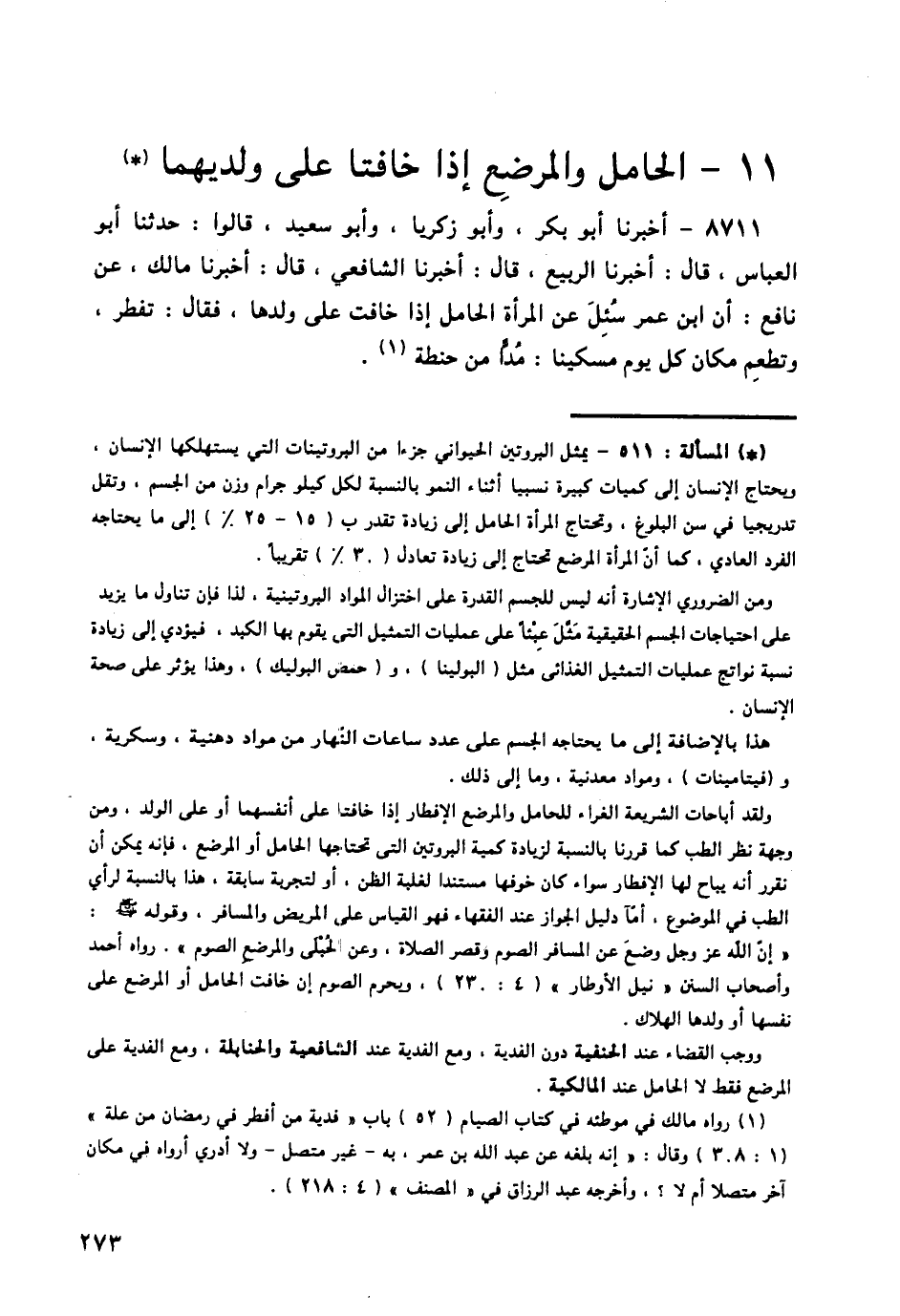 8711 - أَخْبَرَنَا أَبُو بَكْرٍ، وَأَبُو زَكَرِيَّا، وَأَبُو سَعِيدٍ، قَالُوا: حَدَّثَنَا أَبُو الْعَبَّاسِ قَالَ: أَخْبَرَنَا الرَّبِيعُ قَالَ: أَخْبَرَنَا الشَّافِعِيُّ قَالَ: أَخْبَرَنَا مَالِكٌ، عَنْ نَافِعٍ: أَنَّ ابْنَ عُمَرَ، سُئِلَ عَنِ §الْمَرْأَةِ الْحَامِلِ، إِذَا خَافَتْ عَلَى وَلَدِهَا، فَقَالَ: " تُفْطِرُ، وَتُطْعِمُ مَكَانَ كُلِّ يَوْمٍ مِسْكِينًا: مُدًّا مِنْ حِنْطَةٍ " -[274]-،
