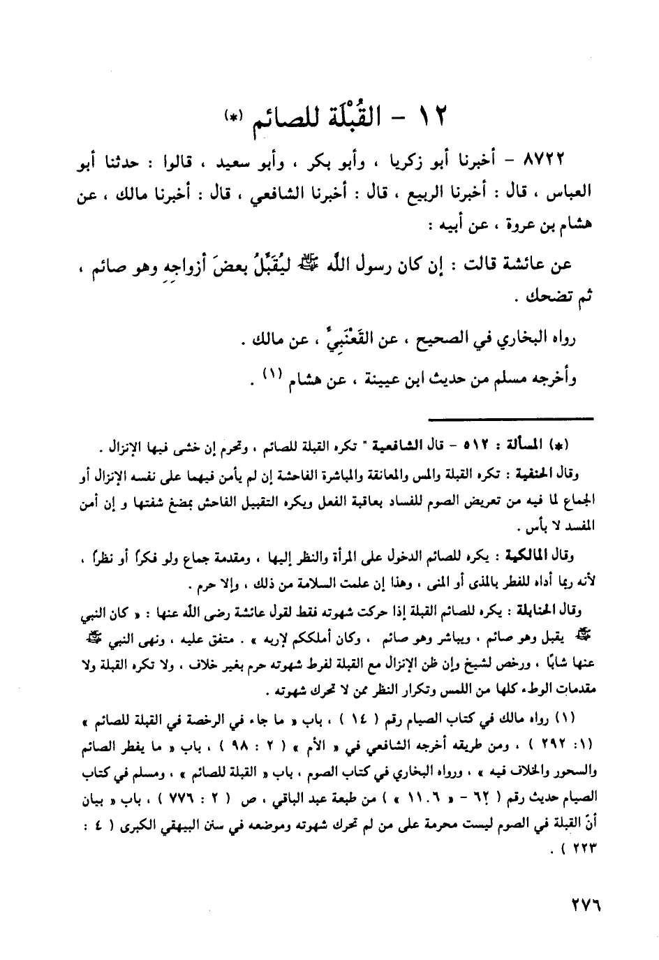 8722 - أَخْبَرَنَا أَبُو زَكَرِيَّا، وَأَبُو بَكْرٍ، وَأَبُو سَعِيدٍ، قَالُوا: حَدَّثَنَا أَبُو الْعَبَّاسِ قَالَ: أَخْبَرَنَا الرَّبِيعُ قَالَ: أَخْبَرَنَا الشَّافِعِيُّ قَالَ: أَخْبَرَنَا مَالِكٌ، عَنْ هِشَامِ بْنِ عُرْوَةَ، عَنْ أَبِيهِ، عَنْ عَائِشَةَ قَالَتْ: «إِنْ §كَانَ رَسُولُ اللَّهِ صَلَّى اللهُ عَلَيْهِ وَسَلَّمَ لَيُقَبِّلُ بَعْضَ أَزْوَاجِهِ وَهُوَ صَائِمٌ»، ثُمَّ تَضْحَكُ، رَوَاهُ الْبُخَارِيُّ فِي الصَّحِيحِ، عَنِ الْقَعْنَبِيِّ، عَنْ مَالِكٍ، وَأَخْرَجَهُ مُسْلِمٌ مِنْ حَدِيثِ ابْنِ عُيَيْنَةَ، عَنْ هِشَامٍ