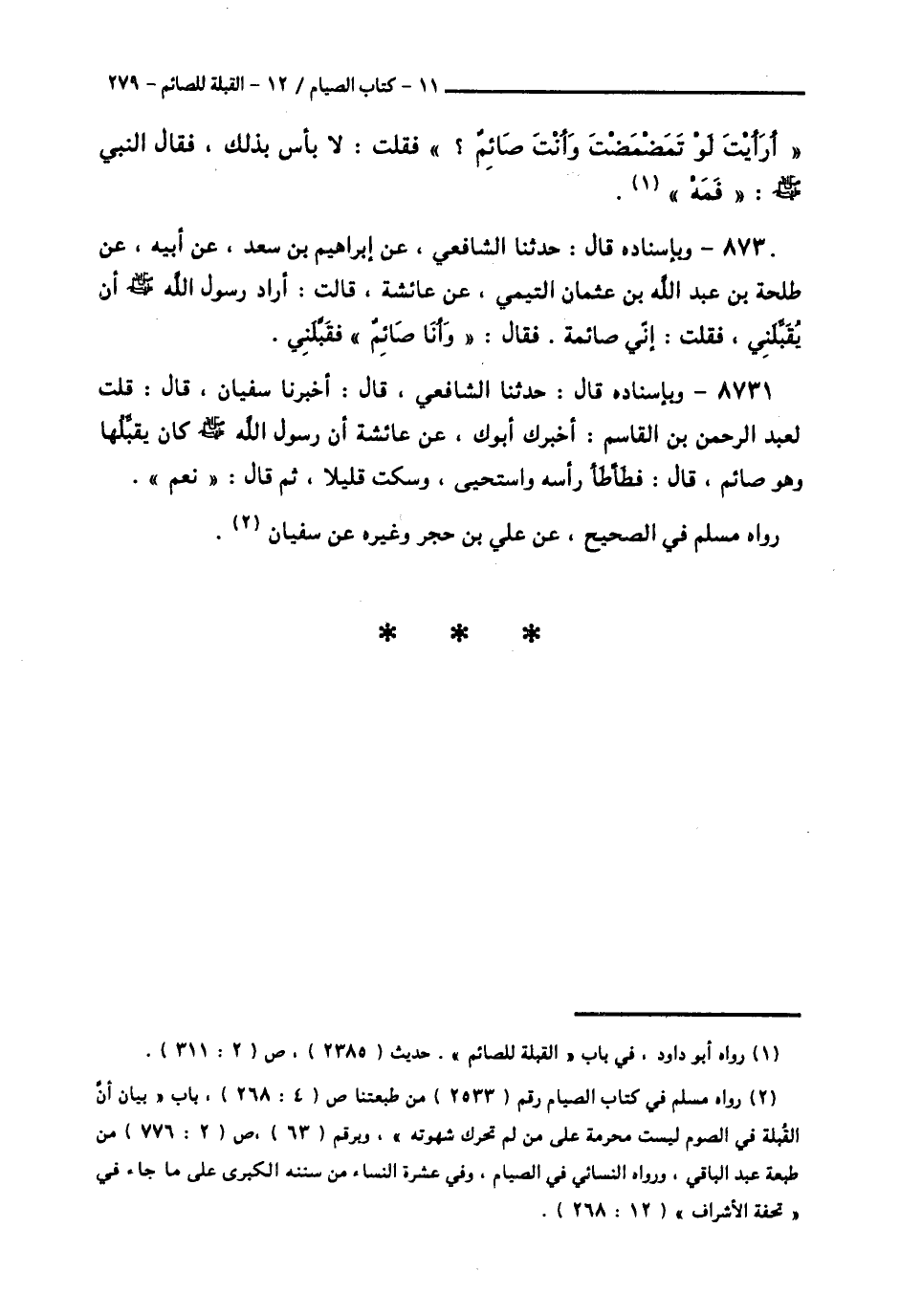 8730 - وَبِإِسْنَادِهِ قَالَ: حَدَّثَنَا الشَّافِعِيُّ، عَنْ إِبْرَاهِيمَ بْنِ سَعْدٍ، عَنْ أَبِيهِ، عَنْ طَلْحَةَ بْنِ عَبْدِ اللَّهِ بْنِ عُثْمَانَ التَّيْمِيِّ، عَنْ عَائِشَةَ قَالَتْ: §أَرَادَ رَسُولُ اللَّهِ صَلَّى اللهُ عَلَيْهِ وَسَلَّمَ أَنْ يُقَبِّلَنِي، فَقُلْتُ: إِنِّي صَائِمَةٌ، فَقَالَ: «وَأَنَا صَائِمٌ»، فَقَبَّلَنِي