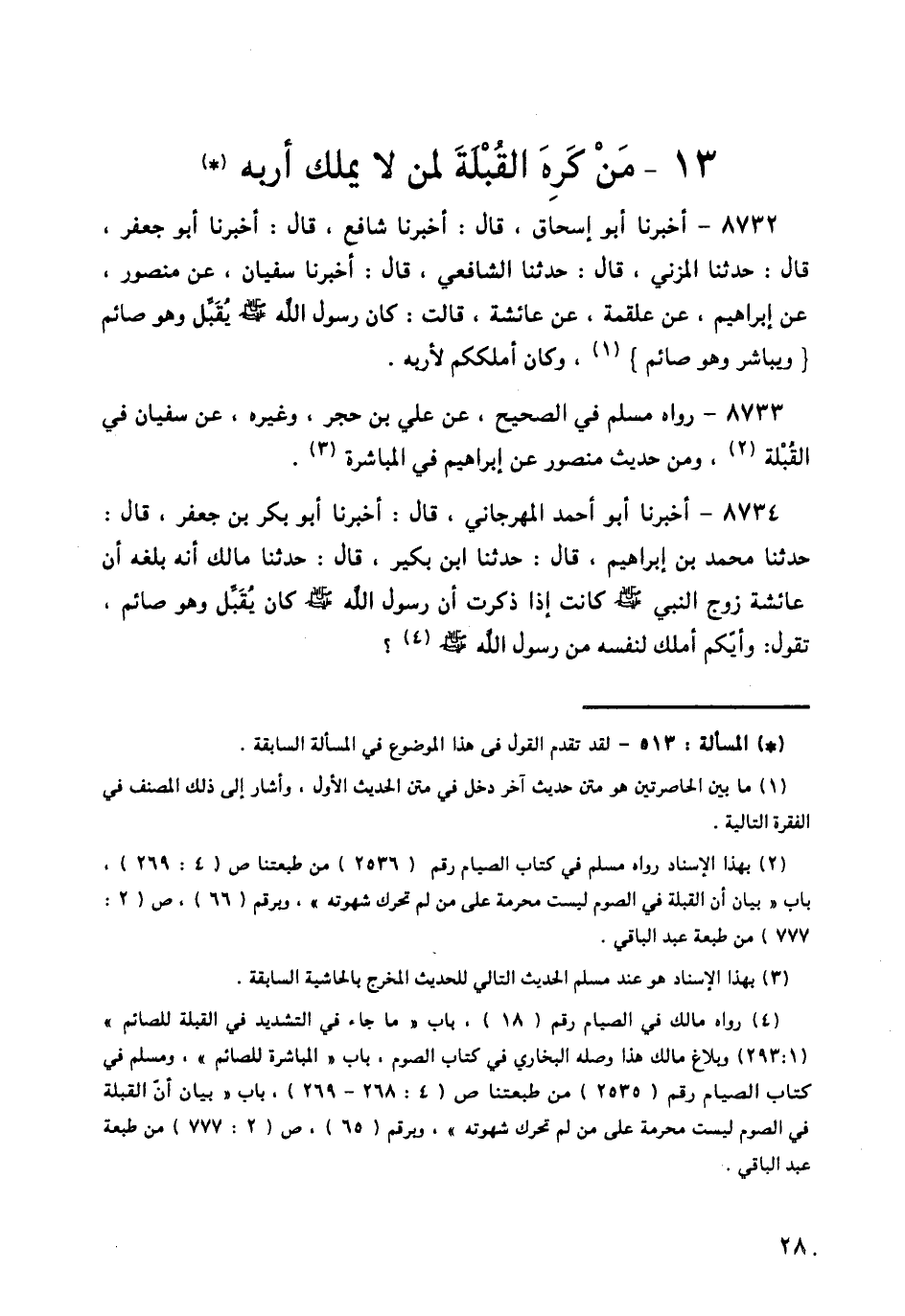 8732 - أَخْبَرَنَا أَبُو إِسْحَاقَ قَالَ: أَخْبَرَنَا شَافِعٌ قَالَ: أَخْبَرَنَا أَبُو جَعْفَرٍ قَالَ: حَدَّثَنَا الْمُزَنِيُّ قَالَ: حَدَّثَنَا الشَّافِعِيُّ قَالَ: أَخْبَرَنَا سُفْيَانُ، عَنْ مَنْصُورٍ، عَنْ إِبْرَاهِيمَ، عَنْ عَلْقَمَةَ، عَنْ عَائِشَةَ قَالَتْ: «كَانَ §رَسُولُ اللَّهِ صَلَّى اللهُ عَلَيْهِ وَسَلَّمَ يُقَبِّلُ وَهُوَ صَائِمٌ، وَيُبَاشِرُ وَهُوَ صَائِمٌ، وَكَانَ أَمْلَكَكُمْ لِإِرْبِهِ»،