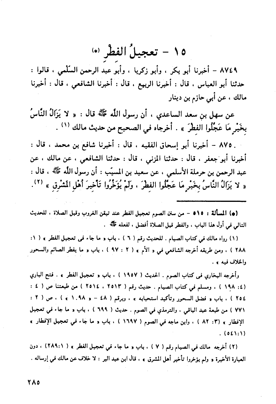 8750 - أَخْبَرَنَا أَبُو إِسْحَاقَ الْفَقِيهُ قَالَ: أَخْبَرَنَا شَافِعُ بْنُ مُحَمَّدٍ قَالَ: أَخْبَرَنَا أَبُو جَعْفَرٍ، قَالَ حَدَّثَنَا الْمُزَنِيُّ قَالَ حَدَّثَنَا الشَّافِعِيُّ، عَنْ مَالِكٍ، عَنْ عَبْدِ الرَّحْمَنِ بْنِ حَرْمَلَةَ الْأَسْلَمِيِّ، عَنْ سَعِيدِ بْنِ الْمُسَيِّبِ: أَنَّ رَسُولَ اللَّهِ صَلَّى اللهُ عَلَيْهِ وَسَلَّمَ قَالَ: «§لَا يَزَالُ النَّاسُ بِخَيْرٍ مَا عَجَّلُوا الْفِطْرَ، وَلَمْ يؤَخِّرُوا تَأْخِيرَ أَهْلِ الْمَشْرِقِ» -[286]-،