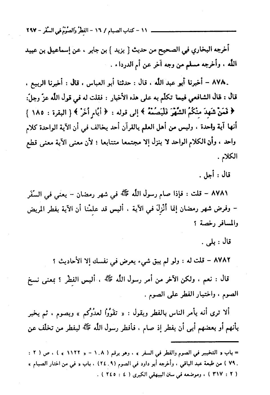 8786 - قَالَ: «فَمَا أَمَرُ عُمَرَ رَجُلًا صَامَ فِي السَّفَرِ أَنْ يُعِيدَ؟»، قُلْتُ: لَا أَعْرِفُهُ عَنْهُ، فَإِنْ عَرَفْتُهُ، فَالْحُجَّةُ ثَابِتَةٌ بِمَا وَصَفْتُ لَكَ، وَأَصْلُ مَا يُذْهَبُ إِلَيْهِ: أَنَّ مَا ثَبَتَ عَنْ رَسُولِ اللَّهِ صَلَّى اللهُ عَلَيْهِ وَسَلَّمَ، فَالْحُجَّةُ لَازِمَةٌ لِلْخَلْقِ بِهِ، وَعَلَى الْخَلْقِ اتِّبَاعُهُ -[299]-،