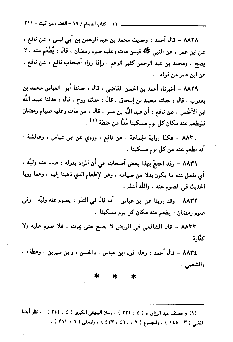 8830 - هَكَذَا رِوَايَةُ الْجَمَاعَةِ، عَنْ نَافِعٍ، وَرُوِيَ عَنِ ابْنِ عَبَّاسٍ، وَعَائِشَةَ: أَنَّهُ يُطْعِمُ عَنْهُ عَنْ كُلِّ يَوْمٍ مِسْكِينًا،