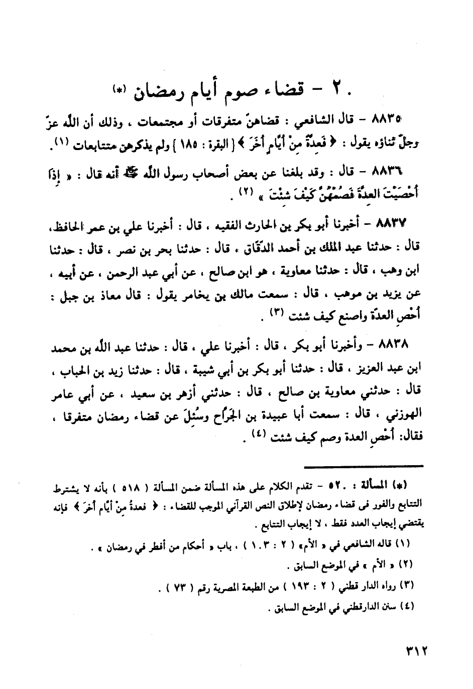 8835 - قَالَ الشَّافِعِيُّ: قَضَاهُنَّ مُتَفَرِّقَاتٍ أَوْ مُجْتَمِعَاتٍ، وَذَلِكَ أَنَّ اللَّهَ عَزَّ وَجَلَّ ثَنَاؤُهُ يَقُولُ: {فَعِدَّةٌ مِنْ أَيَّامٍ أُخَرَ} [البقرة: 184] وَلَمْ يَذْكُرْهُنَّ مُتَتَابِعَاتٍ