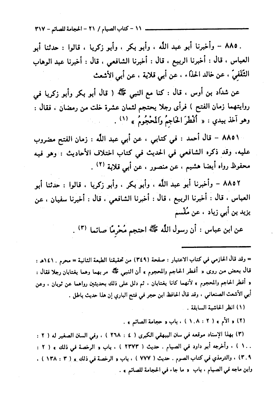 8852 - وَأَخْبَرَنَا أَبُو عَبْدِ اللَّهِ، وَأَبُو بَكْرٍ، وَأَبُو زَكَرِيَّا، قَالُوا: حَدَّثَنَا أَبُو الْعَبَّاسِ قَالَ: أَخْبَرَنَا الرَّبِيعُ قَالَ: أَخْبَرَنَا الشَّافِعِيُّ قَالَ: أَخْبَرَنَا سُفْيَانُ، عَنْ يَزِيدَ بْنِ أَبِي زِيَادٍ، عَنْ مِقْسَمٍ، عَنِ ابْنِ عَبَّاسٍ: «أَنَّ §رَسُولَ اللَّهِ صَلَّى اللهُ عَلَيْهِ وَسَلَّمَ احْتَجَمَ مُحْرِمًا صَائِمًا»