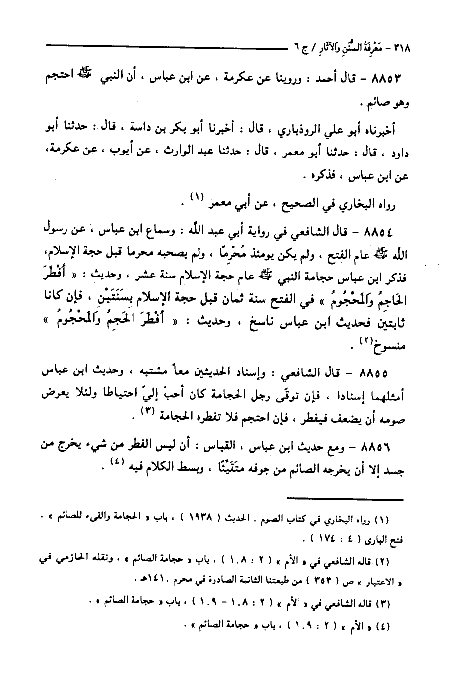 8854 - قَالَ الشَّافِعِيُّ فِي رِوَايَةِ أَبِي عَبْدِ اللَّهِ: وَسَمَاعِ ابْنِ عَبَّاسٍ عَنْ رَسُولِ اللَّهِ صَلَّى اللهُ عَلَيْهِ وَسَلَّمَ عَامَ الْفَتْحِ، وَلَمُ يَكُنْ يَوْمَئِذٍ مُحْرِمًا، وَلَمْ يَصْحَبْهُ مُحْرِمًا قَبْلَ حِجَّةِ الْإِسْلَامِ، فَذَكَرَ ابْنُ عَبَّاسٍ حِجَامَةَ النَّبِيِّ صَلَّى اللهُ عَلَيْهِ وَسَلَّمَ عَامَ حِجَّةِ الْإِسْلَامِ سَنَةَ عَشْرٍ، وَحَدِيثَ: «أَفْطَرَ الْحَاجِمُ وَالْمَحْجُومُ» فِي الْفَتْحِ سَنَةَ ثَمَانٍ قَبْلَ حِجَّةِ الْإِسْلَامِ بِسَنَتَيْنِ، فَإِنْ كَانَا ثَابِتَيْنِ فَحَدِيثُ ابْنُ عَبَّاسٍ نَاسِخٌ، وَحَدِيثُ: «أَفْطَرَ الْحَاجِمُ وَالْمَحْجُومُ» مَنْسُوخٌ