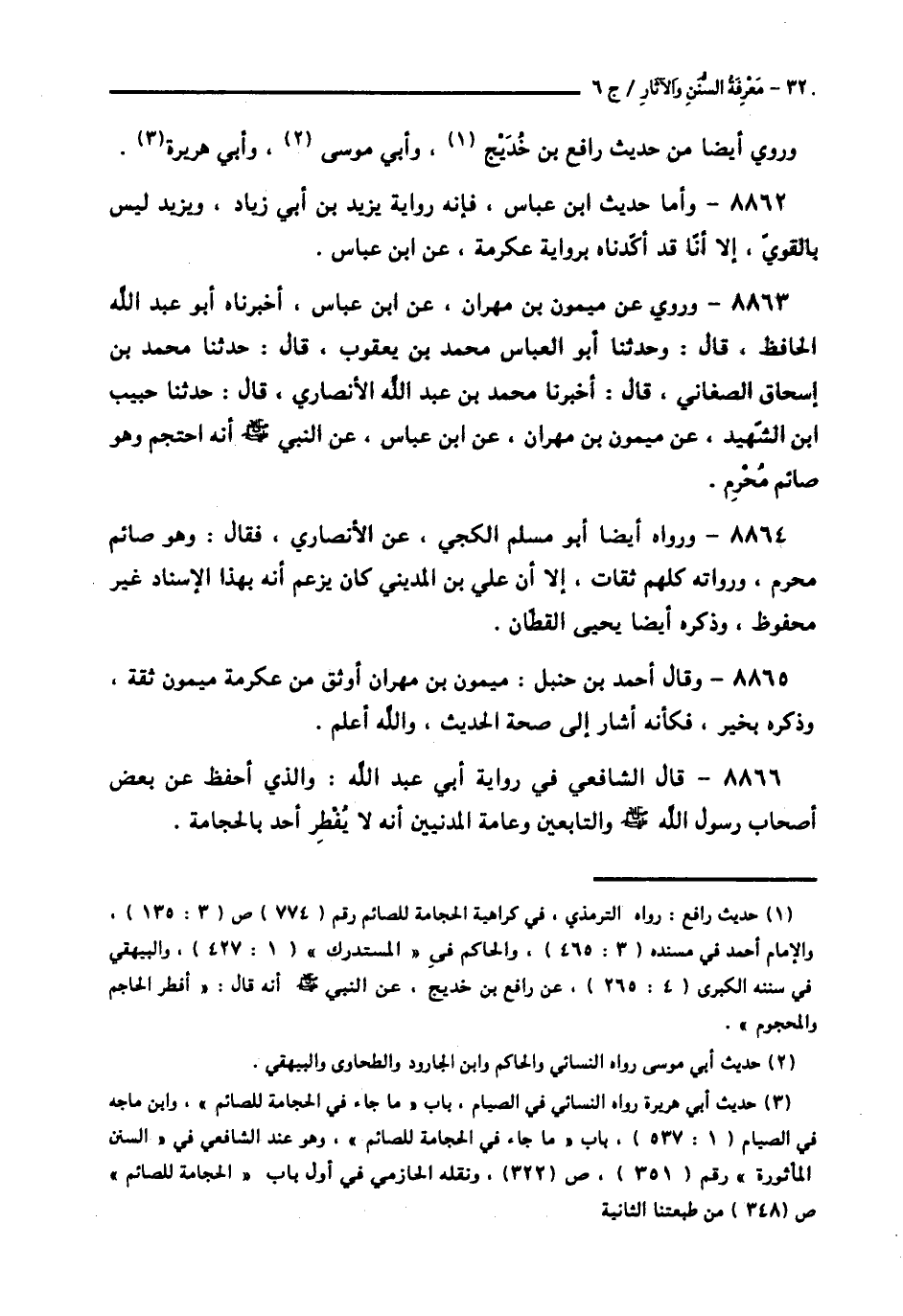8863 - وَرُوِيَ عَنْ مَيْمُونَ بْنِ مِهْرَانَ، عَنِ ابْنِ عَبَّاسٍ، أَخْبَرَنَاهُ أَبُو عَبْدِ اللَّهِ الْحَافِظُ قَالَ: وَحَدَّثَنَا أَبُو الْعَبَّاسِ مُحَمَّدُ بْنُ يَعْقُوبَ قَالَ: حَدَّثَنَا مُحَمَّدُ بْنُ إِسْحَاقَ الصَّغَانِيُّ قَالَ: أَخْبَرَنَا مُحَمَّدُ بْنُ عَبْدِ اللَّهِ الْأَنْصَارِيُّ قَالَ: حَدَّثَنَا حَبِيبُ بْنُ الشَّهِيدِ، عَنْ مَيْمُونَ بْنِ مِهْرَانَ، عَنِ ابْنِ عَبَّاسٍ، عَنِ النَّبِيِّ صَلَّى اللهُ عَلَيْهِ وَسَلَّمَ: «أَنَّهُ §احْتَجَمَ وَهُوَ صَائِمٌ مُحْرِمٌ»،
