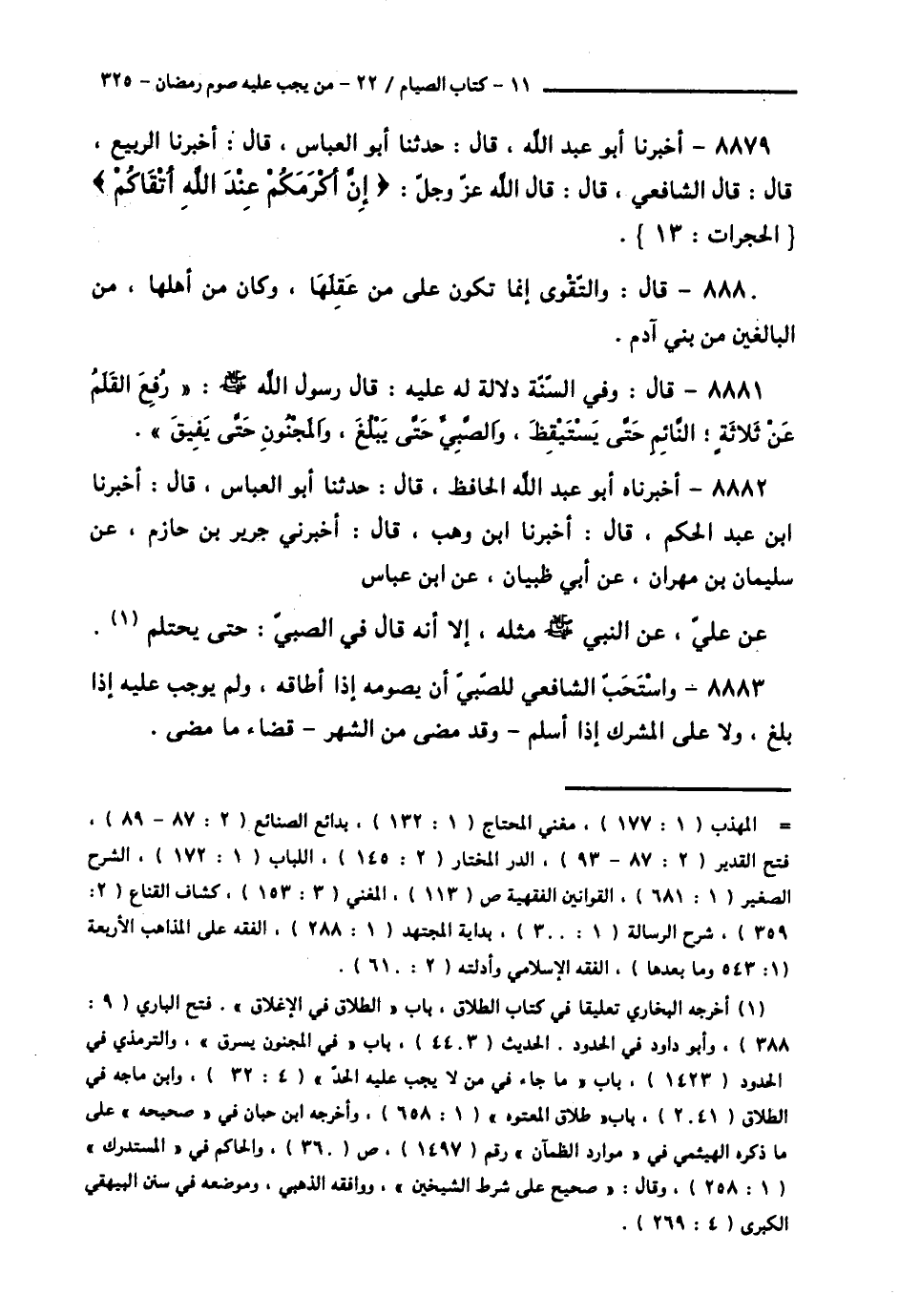 8881 - قَالَ: وَفِي السُّنَّةِ دَلَالَةٌ لَهُ عَلَيْهِ: قَالَ رَسُولُ اللَّهِ صَلَّى اللهُ عَلَيْهِ وَسَلَّمَ: «§رُفَعَ الْقَلَمُ، عَنْ ثَلَاثَةٍ، النَّائِمِ حَتَّى يَسْتَيْقِظَ، وَالصَّبِيِّ حَتَّى يَبْلُغَ، وَالْمَجْنُونِ حَتَّى يُفِيقَ»،