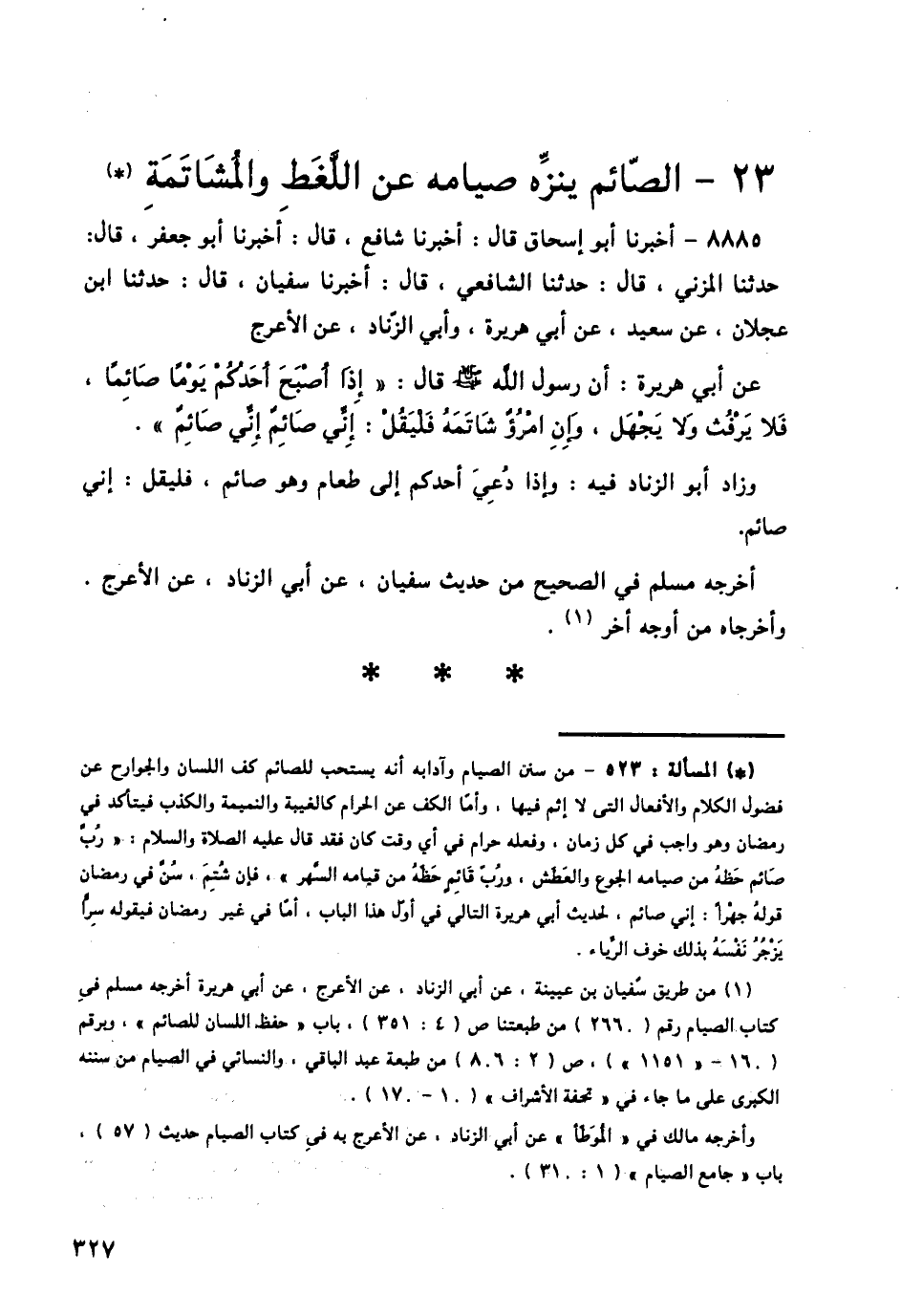 8885 - أَخْبَرَنَا أَبُو إِسْحَاقَ قَالَ: أَخْبَرَنَا شَافِعٌ قَالَ: أَخْبَرَنَا أَبُو جَعْفَرٍ قَالَ: حَدَّثَنَا الْمُزَنِيُّ قَالَ: حَدَّثَنَا الشَّافِعِيُّ قَالَ: أَخْبَرَنَا سُفْيَانُ قَالَ: حَدَّثَنَا ابْنُ عَجْلَانَ، عَنْ سَعِيدٍ، عَنْ أَبِي هُرَيْرَةَ، وَأَبِي الزِّنَادٍ، عَنِ الْأَعْرَجِ، عَنْ أَبِي هُرَيْرَةَ: أَنَّ رَسُولَ اللَّهِ صَلَّى اللهُ عَلَيْهِ وَسَلَّمَ قَالَ: §" إِذَا أَصْبَحَ أَحَدُكُمْ يَوْمًا صَائِمًا فَلَا يَرْفُثْ، وَلَا يَجْهَلْ، وَإِنِ امْرُؤٌ شَاتَمَهُ، فَلْيَقُلْ: إِنِّي صَائِمٌ، إِنِّي صَائِمٌ "، وَزَادَ أَبُو الزِّنَادِ فِيهِ: " وَإِذَا دُعِيَ أَحَدُكُمْ إِلَى طَعَامٍ وَهُوَ صَائِمٌ، فَلْيَقُلْ: إِنِّي صَائِمٌ " أَخْرَجَهُ مُسْلِمٌ فِي الصَّحِيحِ مِنْ حَدِيثِ سُفْيَانَ، عَنْ أَبِي الزِّنَادِ، عَنِ الْأَعْرَجِ وَأَخْرَجَاهُ مِنْ أَوْجُهٍ أُخَرَ
