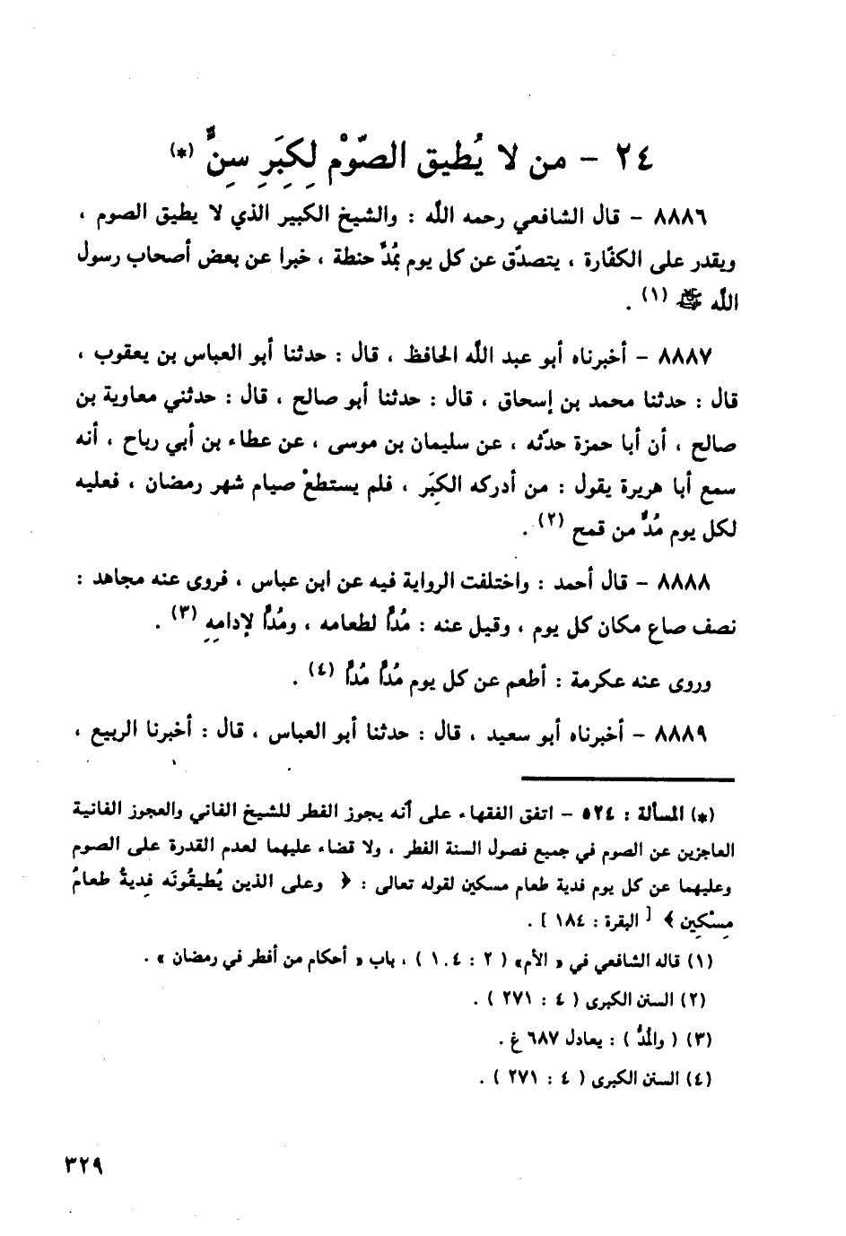 8886 - قَالَ الشَّافِعِيُّ رَحِمَهُ اللَّهُ: «الشَّيْخُ الْكَبِيرُ الَّذِي لَا يُطِيقُ الصَّوْمَ، وَيَقْدِرُ عَلَى الْكَفَّارَةِ، يَتَصَدَّقُ عَنْ كُلِّ يَوْمٍ بِمُدِّ حِنْطَةٍ، خَبَرًا عَنْ بَعْضِ أَصْحَابِ رَسُولِ اللَّهِ صَلَّى اللهُ عَلَيْهِ وَسَلَّمَ»،